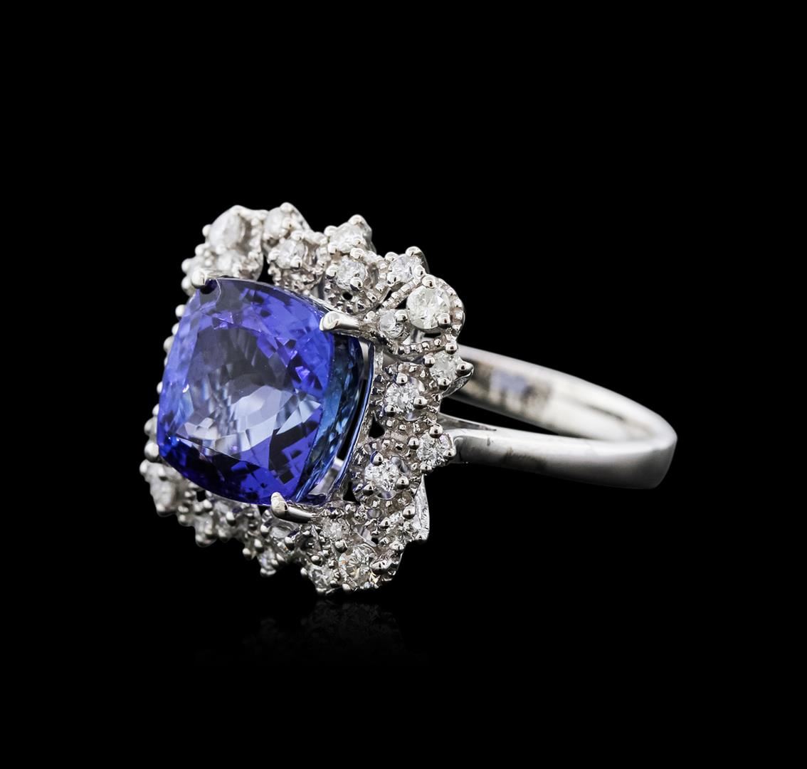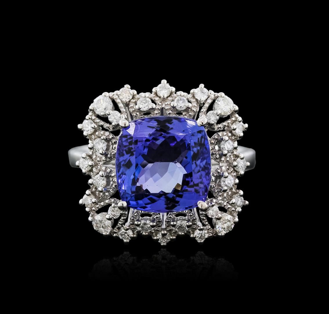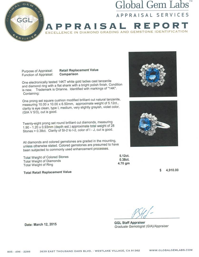 One electronically tested 14KT white gold ladies cast tanzanite and diamond ring with a flat shank with a bright polish finish. Trademark is Orianne. Identified with markings of "14K". Condition is new. Containing: One prong set square cushion modified brilliant cut natural tanzanite, measuring 10.00 x 10.00 x 6.50mm, approximate weight of 5.12ct., clarity is eye clean, type I, medium, very slightly grayish, violet color, (GIA V 5/3), cut is good. Twenty-Eight prong set round brilliant cut diamonds, measuring 1.90 - 1.20 x 0.93mm (depth est.) approximate total weight of 28 Stones = 0.38ct. Clarity: SI-2 to I-2. Color: I - J, Cut is Good. All diamonds and colored gemstones are graded in the mounting, unless otherwise stated. Colored gemstones are presumed to have been subjected to commonly used enhancement processes.. Total Weight of Colored Stones 5.12ct. Total Weight of Diamonds 0.38ct. Total Weight of Ring 4.70 grams. GGL Appraised at $4,910.00.