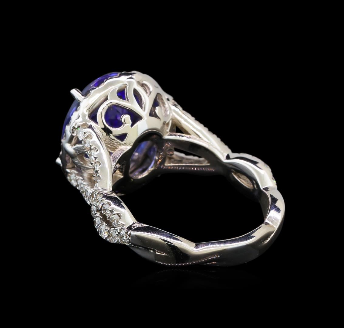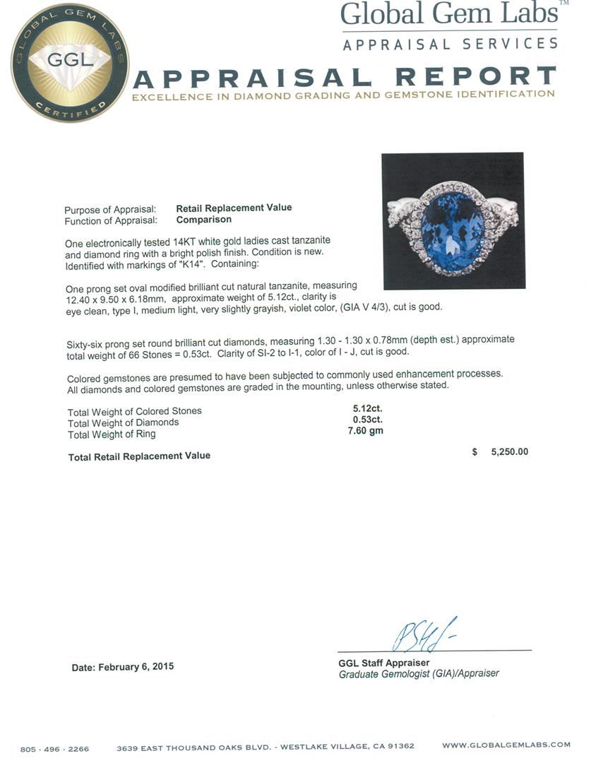 One electronically tested 14KT white gold ladies cast tanzanite and diamond ring with a bright polish finish. Identified with markings of "K14". Condition is new. Containing: One prong set oval modified brilliant cut natural tanzanite, measuring 12.40 x 9.50 x 6.18mm, approximate weight of 5.12ct., clarity is eye clean, type I, medium light, very slightly grayish, violet color, (GIA V 4/3), cut is good. Sixty-Six prong set round brilliant cut diamonds, measuring 1.30 - 1.30 x 0.78mm (depth est.) approximate. Total Weight of 66 Stones = 0.53ct. Clarity: SI-2 to I-1. Color: I - J, Cut is Good. Colored gemstones are presumed to have been subjected to commonly used enhancement processes. All diamonds and colored gemstones are graded in the mounting, unless otherwise stated. Total Weight of Colored Stones 5.12ct. Total Weight of Diamonds 0.53ct. Total Weight of Ring 7.60 grams. GGL Appraised at $5,250.00.