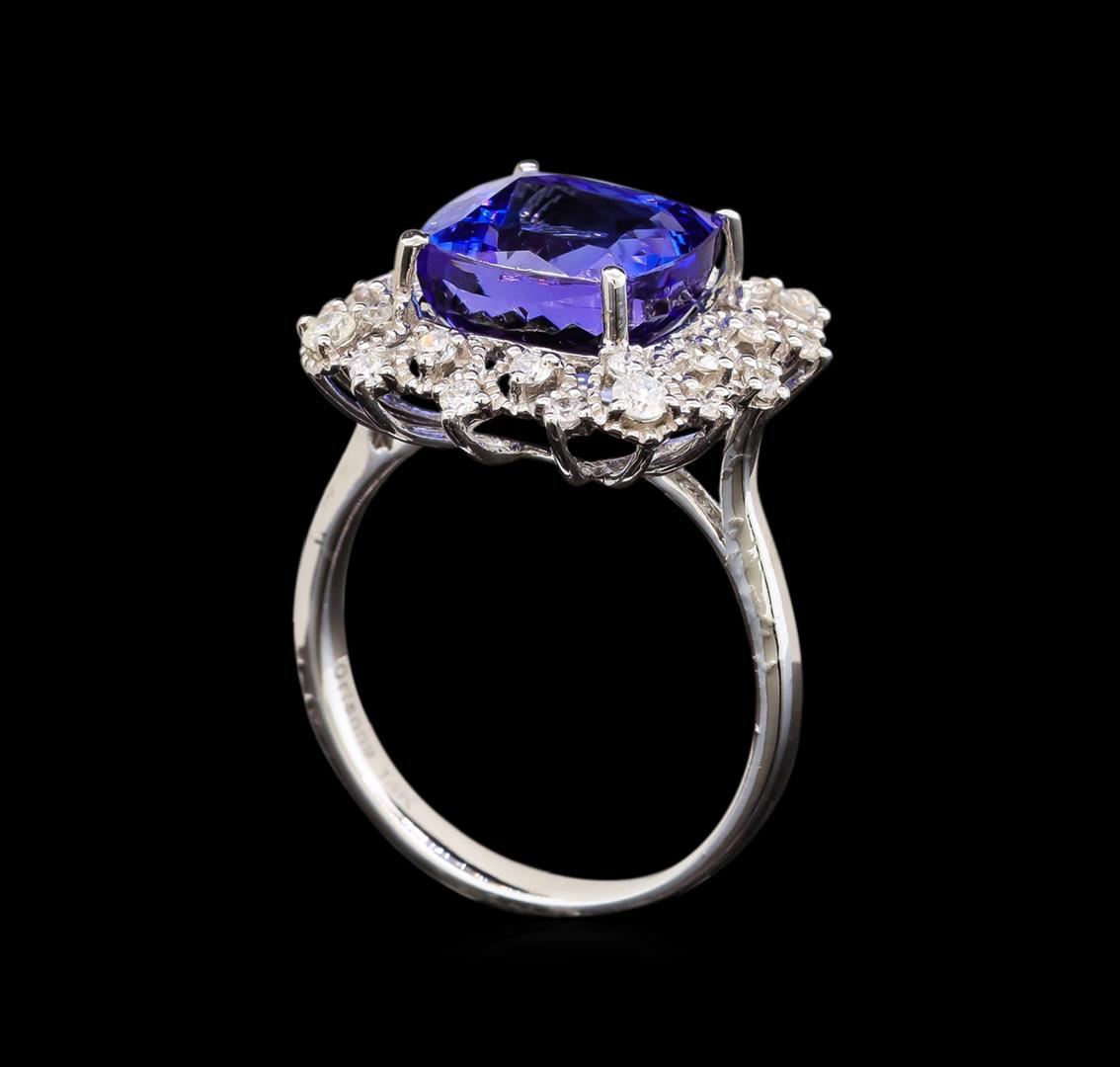 One electronically tested 14KT white gold ladies cast tanzanite and diamond ring with a flat shank with a bright polish finish. Trademark is Orianne. Identified with markings of "14K". Condition is new. Containing: One prong set square cushion modified brilliant cut natural tanzanite, measuring 10.00 x 10.00 x 6.50mm, approximate weight of 5.12ct., clarity is eye clean, type I, medium, very slightly grayish, violet color, (GIA V 5/3), cut is good. Twenty-Eight prong set round brilliant cut diamonds, measuring 1.90 - 1.20 x 0.93mm (depth est.) approximate total weight of 28 Stones = 0.38ct. Clarity: SI-2 to I-2. Color: I - J, Cut is Good. All diamonds and colored gemstones are graded in the mounting, unless otherwise stated. Colored gemstones are presumed to have been subjected to commonly used enhancement processes.. Total Weight of Colored Stones 5.12ct. Total Weight of Diamonds 0.38ct. Total Weight of Ring 4.70 grams. GGL Appraised at $4,910.00.