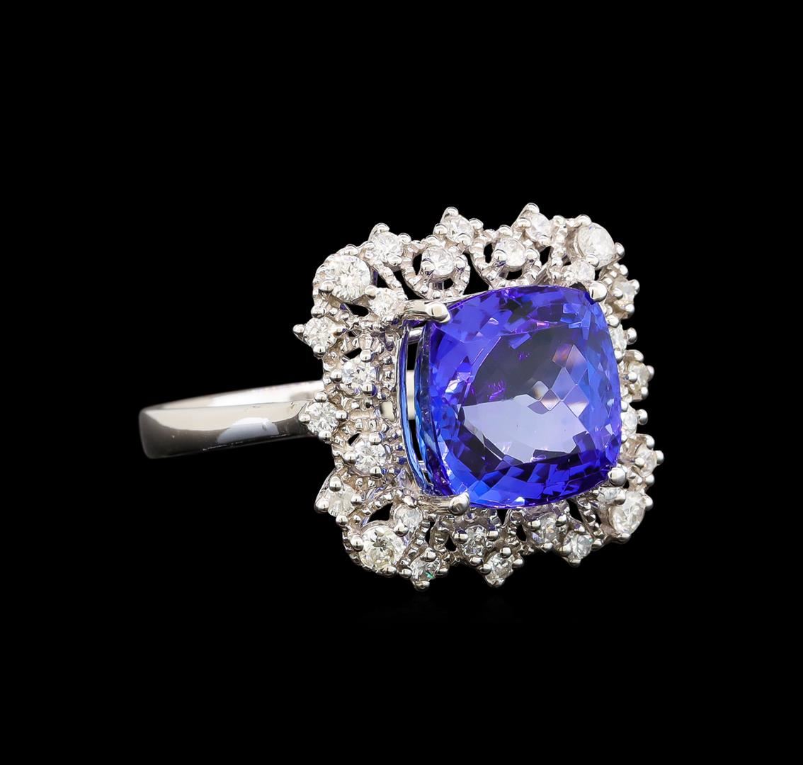 One electronically tested 14KT white gold ladies cast tanzanite and diamond ring with a flat shank with a bright polish finish. Trademark is Orianne. Identified with markings of "14K". Condition is new. Containing: One prong set square cushion modified brilliant cut natural tanzanite, measuring 10.00 x 10.00 x 6.50mm, approximate weight of 5.12ct., clarity is eye clean, type I, medium, very slightly grayish, violet color, (GIA V 5/3), cut is good. Twenty-Eight prong set round brilliant cut diamonds, measuring 1.90 - 1.20 x 0.93mm (depth est.) approximate total weight of 28 Stones = 0.38ct. Clarity: SI-2 to I-2. Color: I - J, Cut is Good. All diamonds and colored gemstones are graded in the mounting, unless otherwise stated. Colored gemstones are presumed to have been subjected to commonly used enhancement processes.. Total Weight of Colored Stones 5.12ct. Total Weight of Diamonds 0.38ct. Total Weight of Ring 4.70 grams. GGL Appraised at $4,910.00.