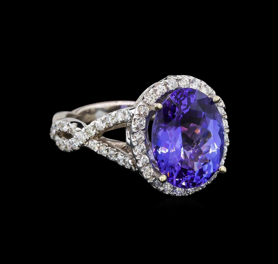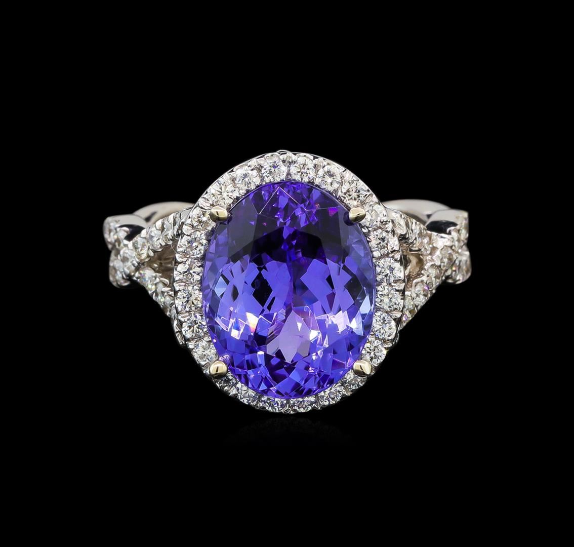One electronically tested 14KT white gold ladies cast tanzanite and diamond ring with a bright polish finish. Identified with markings of "K14". Condition is new. Containing: One prong set oval modified brilliant cut natural tanzanite, measuring 12.40 x 9.50 x 6.18mm, approximate weight of 5.12ct., clarity is eye clean, type I, medium light, very slightly grayish, violet color, (GIA V 4/3), cut is good. Sixty-Six prong set round brilliant cut diamonds, measuring 1.30 - 1.30 x 0.78mm (depth est.) approximate. Total Weight of 66 Stones = 0.53ct. Clarity: SI-2 to I-1. Color: I - J, Cut is Good. Colored gemstones are presumed to have been subjected to commonly used enhancement processes. All diamonds and colored gemstones are graded in the mounting, unless otherwise stated. Total Weight of Colored Stones 5.12ct. Total Weight of Diamonds 0.53ct. Total Weight of Ring 7.60 grams. GGL Appraised at $5,250.00.