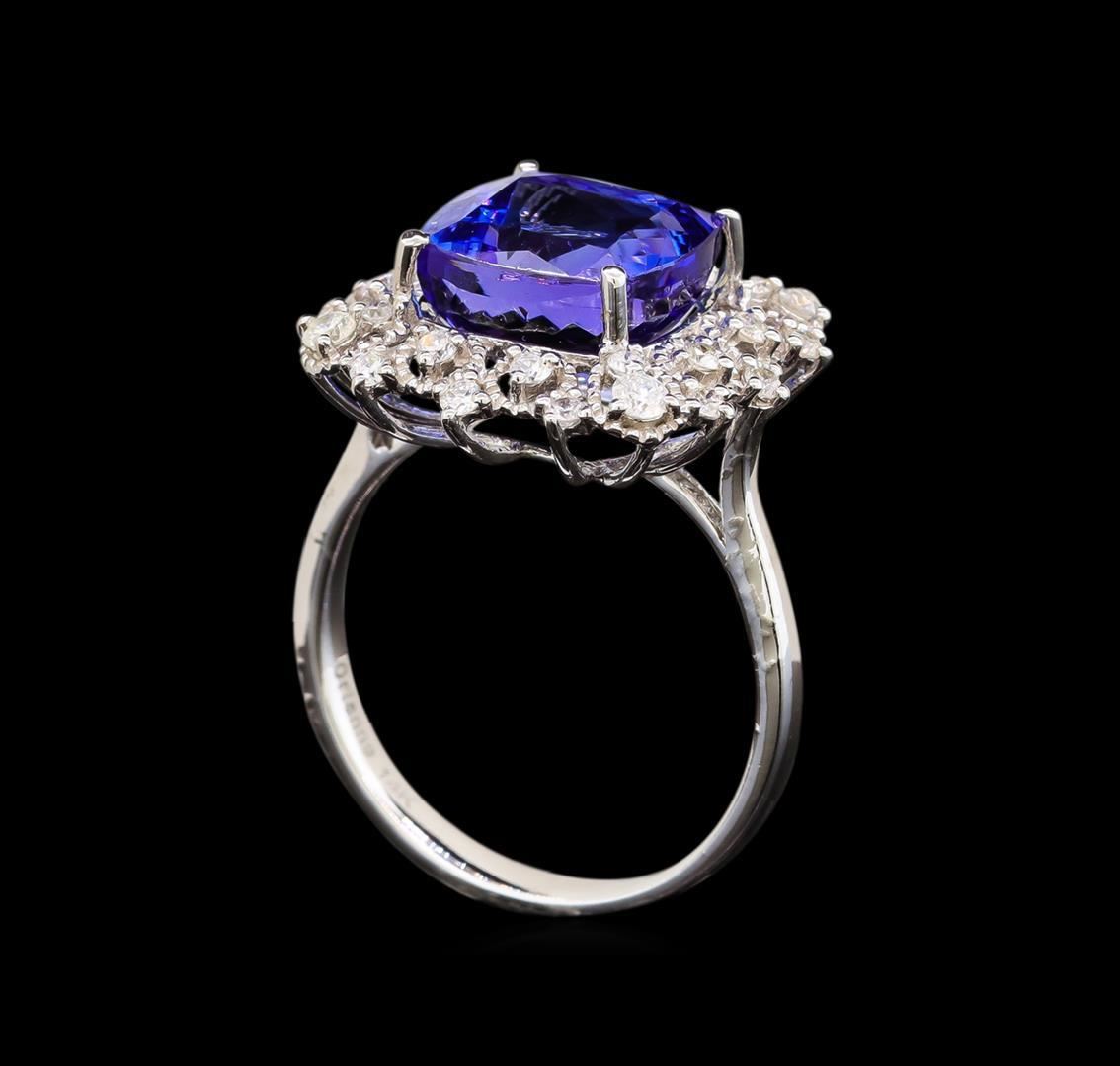 One electronically tested 14KT white gold ladies cast tanzanite and diamond ring with a flat shank with a bright polish finish. Trademark is Orianne. Identified with markings of "14K". Condition is new. Containing: One prong set square cushion modified brilliant cut natural tanzanite, measuring 10.00 x 10.00 x 6.50mm, approximate weight of 5.12ct., clarity is eye clean, type I, medium, very slightly grayish, violet color, (GIA V 5/3), cut is good. Twenty-Eight prong set round brilliant cut diamonds, measuring 1.90 - 1.20 x 0.93mm (depth est.) approximate total weight of 28 Stones = 0.38ct. Clarity: SI-2 to I-2. Color: I - J, Cut is Good. All diamonds and colored gemstones are graded in the mounting, unless otherwise stated. Colored gemstones are presumed to have been subjected to commonly used enhancement processes.. Total Weight of Colored Stones 5.12ct. Total Weight of Diamonds 0.38ct. Total Weight of Ring 4.70 grams. GGL Appraised.