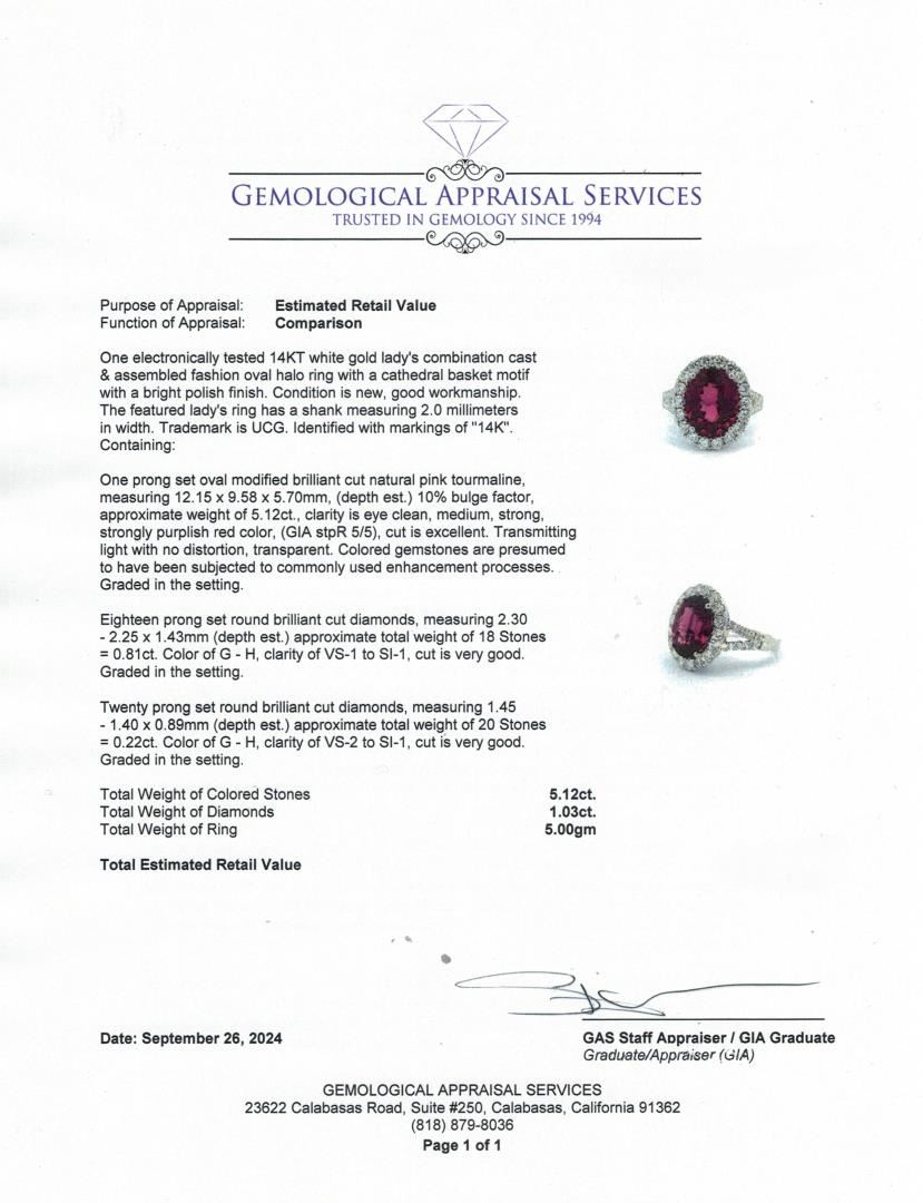 One electronically tested 14KT white gold lady's combination cast & assembled fashion oval halo ring with a cathedral basket motif with a bright polish finish. The featured lady's ring has a shank measuring 2.0 millimeters in width. Trademark is UCG. Identified with markings of "14K". Condition is new, good workmanship.Containing: One prong set oval modified brilliant cut natural pink tourmaline, measuring 12.15 x 9.58 x 5.70mm, (depth est.) 10% bulge factor, approximate weight of 5.12ct., clarity is eye clean, medium, strong, strongly purplish red color, (GIA stpR 5/5), cut is excellent. Transmitting light with no distortion, transparent. Colored gemstones are presumed to have been subjected to commonly used enhancement processes. Graded in the setting. Eighteen prong set round brilliant cut diamonds, measuring 2.30 - 2.25 x 1.43mm (depth est.) approximate total weight of 18 Stones = 0.81ct. Graded in the setting. Color: G - H. Clarity: VS-1 to SI-1. Cut: Very Good. Twenty prong set round brilliant cut diamonds, measuring 1.45 - 1.40 x 0.89mm (depth est.) approximate total weight of 20 Stones = 0.22ct. Graded in the setting. Color: G - H. Clarity: VS-2 to SI-1. Cut: Very Good. Total Weight of Colored Stones: 5.12ct. Total Weight of Diamonds: 1.03ct. Total Weight of Ringg: 5.00gm. Appraised by Gemological Appraisal Services. GAS Appraised.