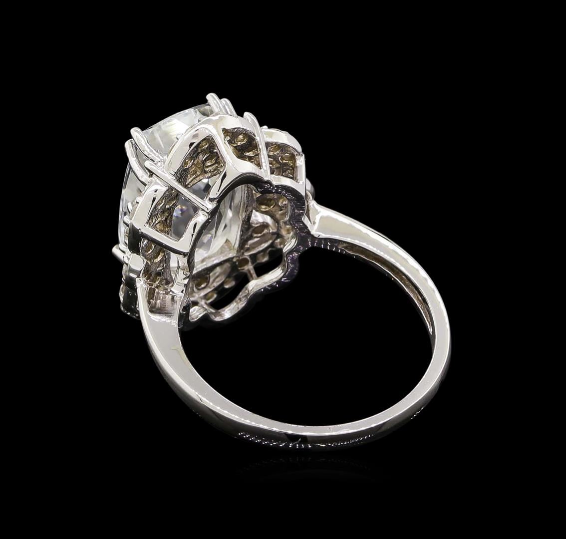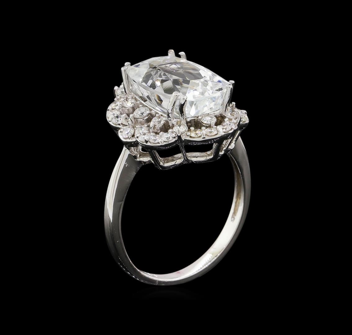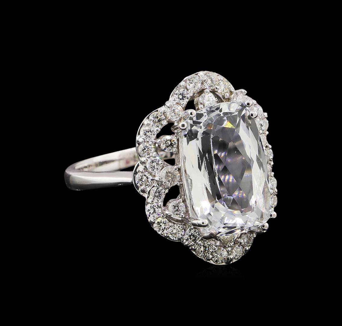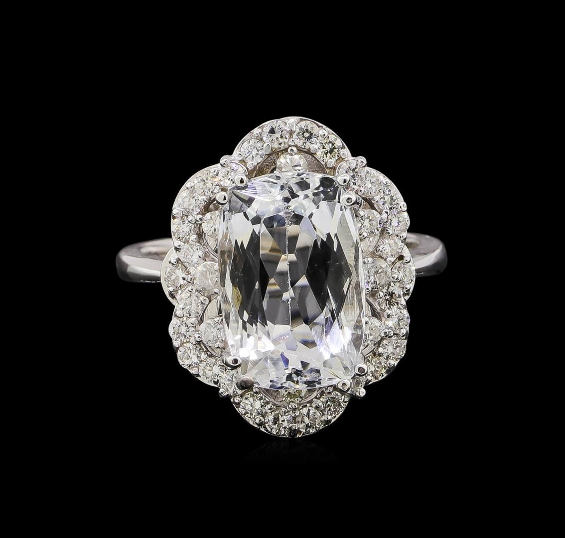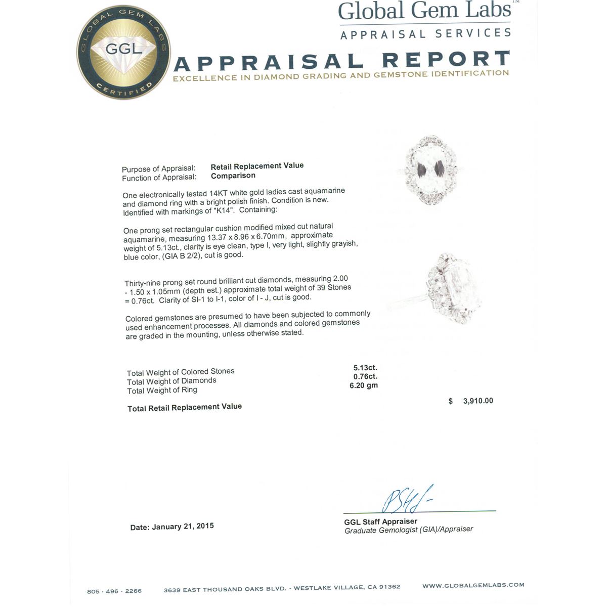 One electronically tested 14KT white gold ladies cast aquamarine and diamond ring with a bright polish finish. Identified with markings of "K14". Condition is new. Containing: One prong set rectangular cushion modified mixed cut natural aquamarine, measuring 13.37 x 8.96 x 6.70mm, approximate weight of 5.13ct., clarity is eye clean, type I, very light, slightly grayish, blue color, (GIA B 2/2), cut is good. Thirty-Nine prong set round brilliant cut diamonds, measuring 2.00 - 1.50 x 1.05mm (depth est.) approximate total weight of 39 Stones = 0.76ct. Clarity: SI-1 to I-1. Color: I - J, Cut is Good. Colored gemstones are presumed to have been subjected to commonly used enhancement processes. All diamonds and colored gemstones are graded in the mounting, unless otherwise stated. Total Weight of Colored Stones 5.13ct. Total Weight of Diamonds 0.76ct. Total Weight of Ring 6.20 grams. GGL Appraised at $3,910.00.