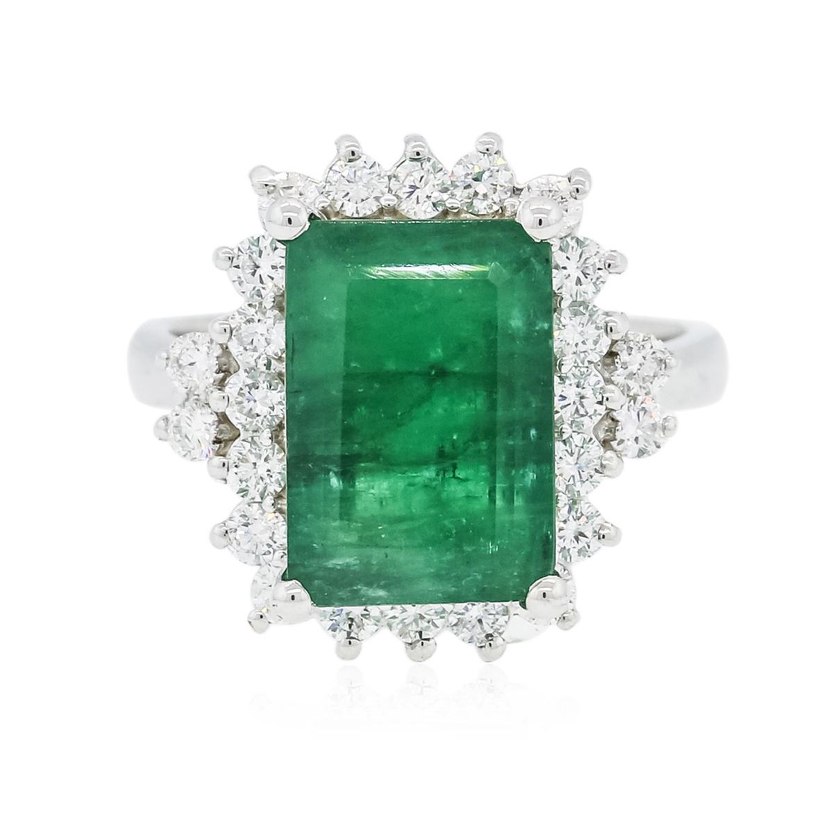 One electronically tested 14KT white gold ladies combination cast & assembled emerald and diamond ring with a flat shank with a bright polish finish. Identified with markings of "14K". Condition is new. Containing: One prong set emerald standard step cut natural emerald, measuring 12.19 x 8.51 x 6.73mm, approximate weight of 5.13ct., clarity is heavily included, type III, medium, moderately strong, green color, (GIA G 5/4), cut is good. Twenty-Four prong set round brilliant cut diamonds, measuring 1.80 - 1.80 x 1.08mm (depth est.) approximate total weight of 24 Stones = 0.51ct. Clarity: SI-1 to SI-2. Color: H - J, Cut is Good. Colored gemstones are presumed to have been subjected to commonly used enhancement processes. All diamonds and colored gemstones are graded in the mounting, unless otherwise stated. Total Weight of Colored Stones 5.13ct. Total Weight of Diamonds 0.51ct. Total Weight of Ring 6.70 grams. GGL Appraised at $8,860.00.