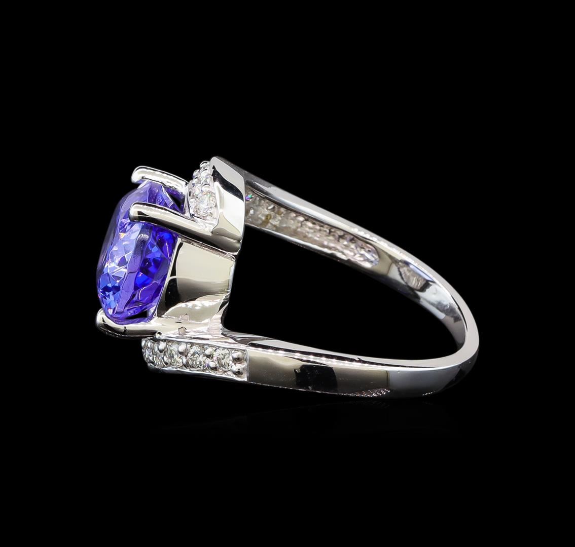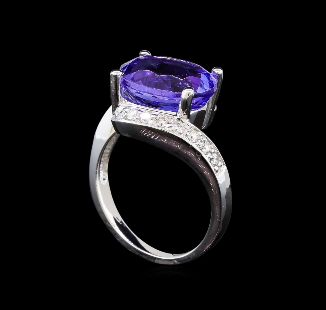 One electronically tested 14KT white gold ladies cast tanzanite and diamond ring with a bright polish finish. Condition is new. Containing: One prong set oval modified brilliant cut natural tanzanite, measuring 12.10 x 9.62 x 6.26mm, approximate weight of 5.13ct., clarity is eye clean, type I, medium light, very slightly grayish, violet color, (GIA V 4/3), cut is good. Sixteen prong set round brilliant cut diamonds, measuring 1.50 - 1.50 x 0.90mm (depth est.) approximate total weight of 16 Stones = 0.20ct. Clarity: SI-1 to SI-2. Color: I - J, Cut is Good. Colored gemstones are presumed to have been subjected to commonly used enhancement processes. All diamonds and colored gemstones are graded in the mounting, unless otherwise stated. Total Weight of Colored Stones 5.13ct. Total Weight of Diamonds 0.20ct. Total Weight of Ring 6.00 grams. GGL Appraised at $5,265.00.