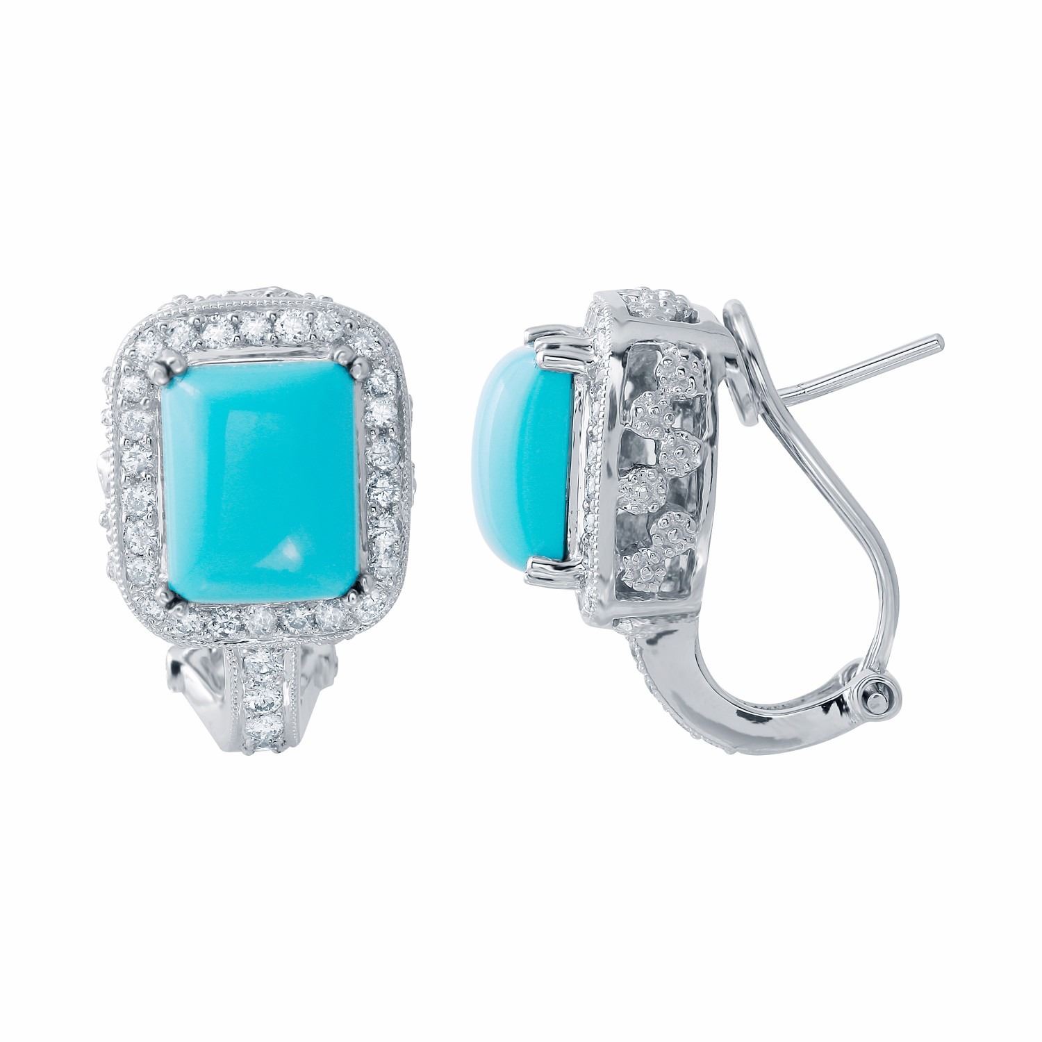 One 14KT White Gold 5.14ctw Turquoise and Diamond Earrings. (2) Turquoise stones with a total weight of 5.14cts. (60) Diamonds with a total weight of 0.80cts. Total weight of these earrings are 9.16 grams.