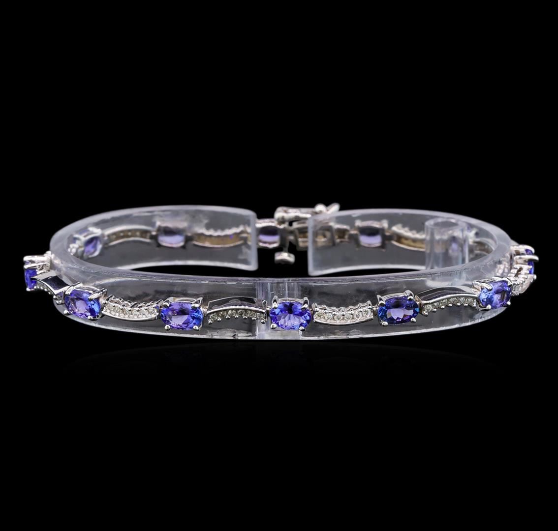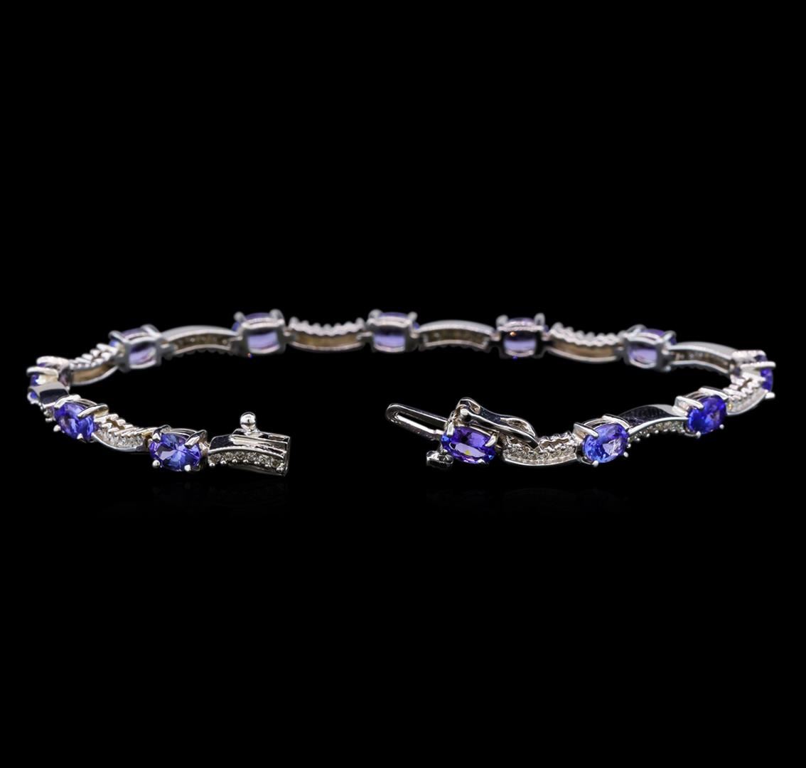 One electronically tested 14KT white gold ladies cast tanzanite and diamond bracelet with a hidden box clasp with safety closer with a bright polish finish. Measurements: 7" in length. Identified with markings of "14K". Condition is new. Containing: Twelve prong set oval modified brilliant cut natural tanzanites, measuring 5.70 x 4.00 x 2.60mm, approximate total weight of 5.15ct., clarity is eye clean, type I, light, very slightly grayish, violet color, (GIA V 3/3), cut is good. Seventy-Two prong set round brilliant cut diamonds, measuring 1.40 - 1.40 x 0.84mm (depth est.) approximate total weight of 72 Stones = 0.48ct. Clarity: SI-2 to I-1. Color: I - J, Cut is Good. Colored gemstones are presumed to have been subjected to commonly used enhancement processes. All diamonds and colored gemstones are graded in the mounting, unless otherwise stated. Total Weight of Colored Stones 5.15ct. Total Weight of Diamonds 0.48ct. Total Weight of Bracelet 10.90 grams. GGL Appraised at $4,195.00.
