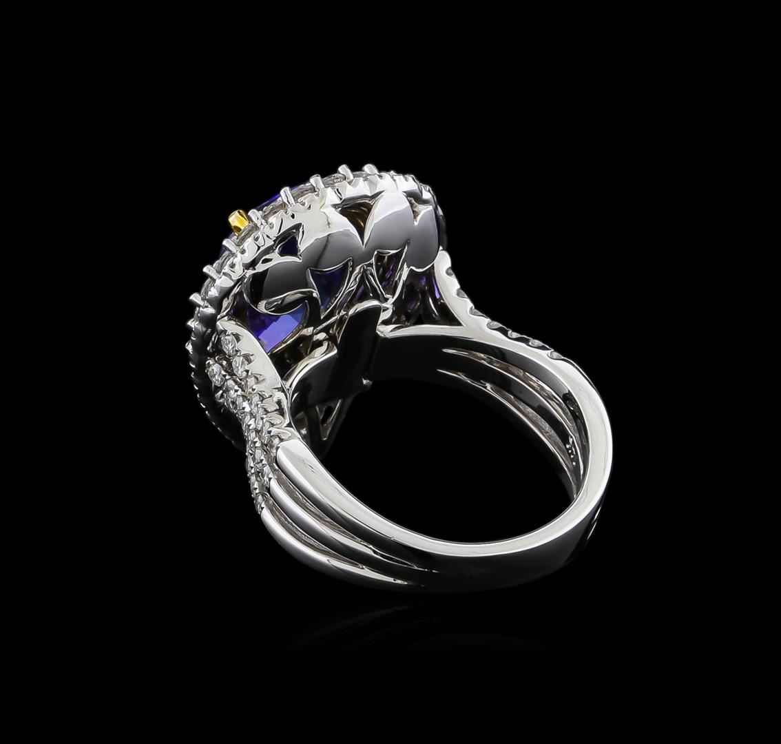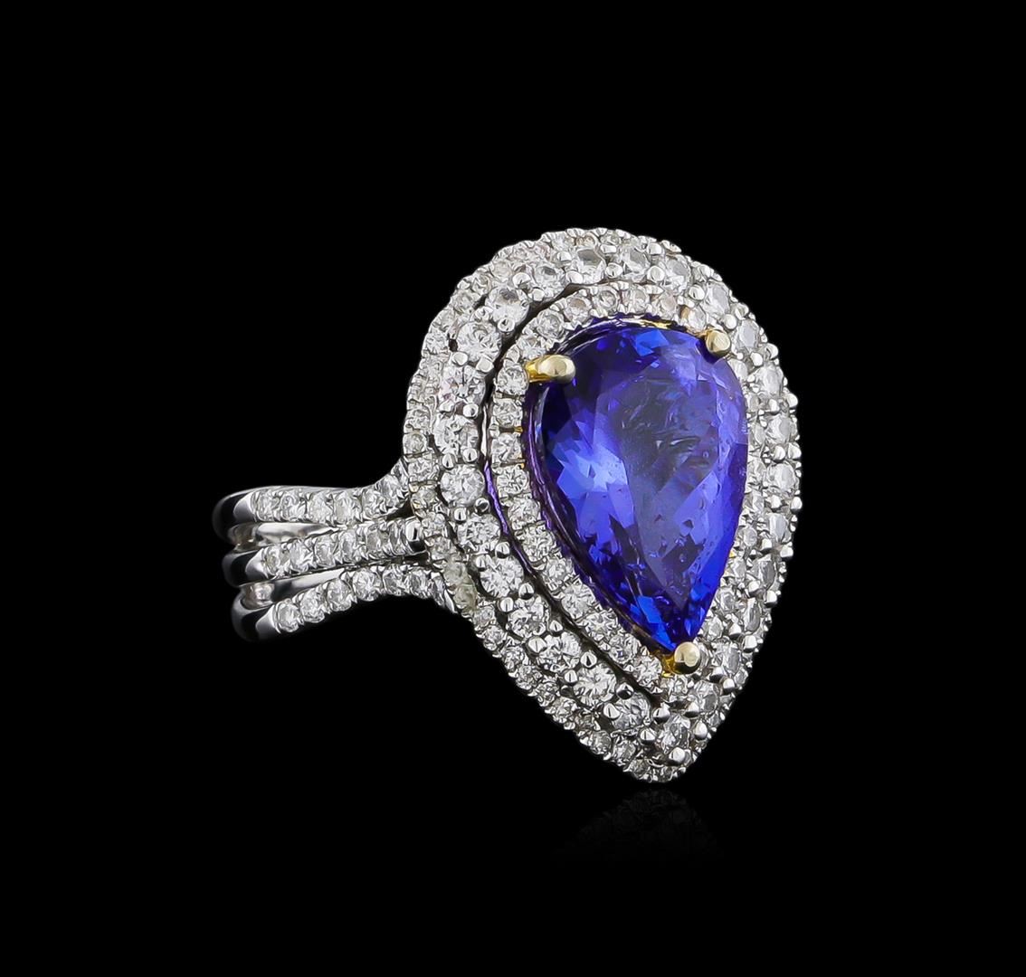 One electronically tested 14KT white gold ladies cast tanzanite & diamond pendant/ring with a bright finish. The featured tanzanite is set within tiered diamond bezels, supported by an elaborate white gold lattice under gallery and diamond set shoulders, completed by a three millimeter wide band. The gemstone section( 22 x 17mm) can be removed from the ring and be worn as a pendant. Identified with markings of "14K". Condition is new, good workmanship. Containing: One prong set pear mixed cut natural tanzanite, measuring 13.00 x 9.00 x 6.15mm, 7% bulge factor, approximate weight of 5.16ct., clarity is eye clean, type I, medium dark, very slightly grayish, violetish blue color, (GIA vB 6/3), cut is good. Transmitting light with no distortion, transparent. Colored Stone Grading Report attached. Graded in the setting. One Hundred Fifty-Four prong set round brilliant cut diamonds, measuring 1.80 - 1.00 x 0.84mm (depth est.) approximate total weight of 154 Stones = 1.54ct. Graded in the setting. Clarity: SI-2 to I-1. Color: G - I. Total Weight of Colored Stones 5.16ct. Total Weight of Diamonds 1.54ct. Total Weight of Pendant/Ring 10.74 grams. AIG Appraised at $18,300.00.