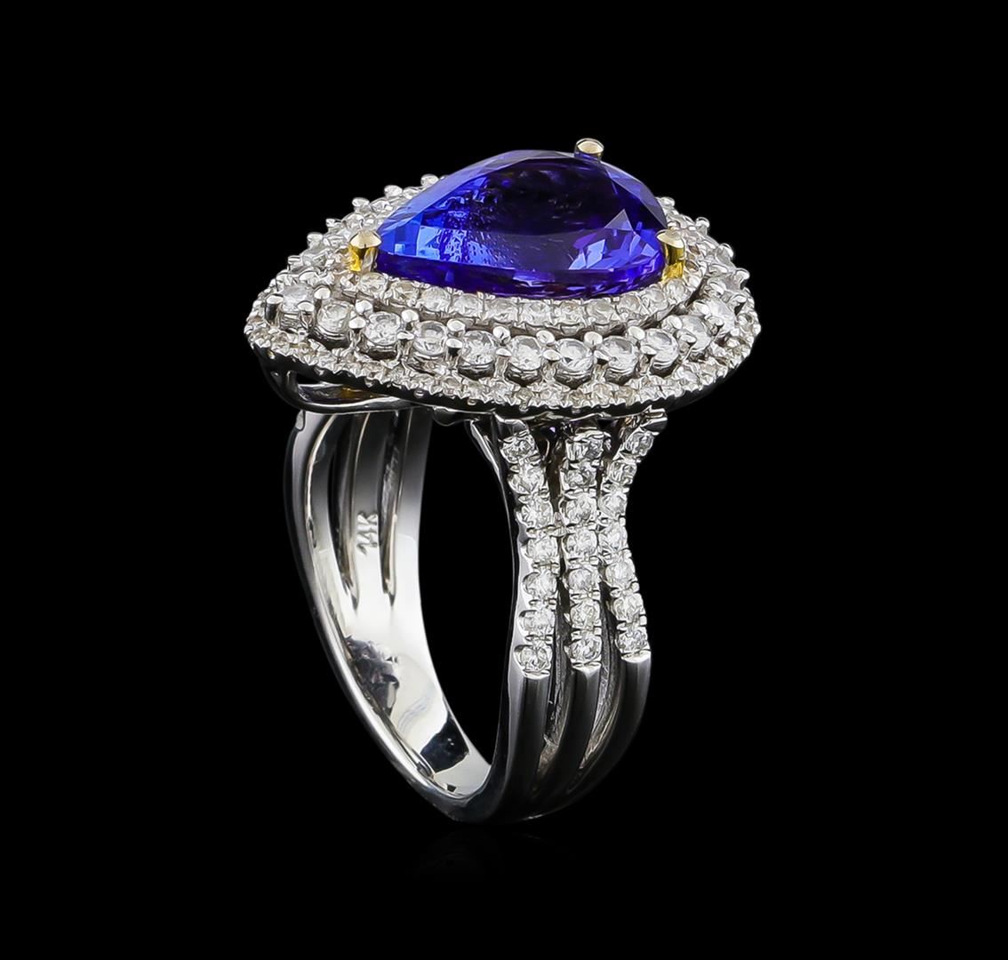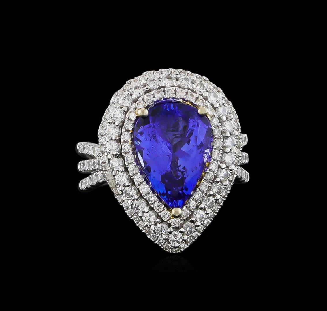 One electronically tested 14KT white gold ladies cast tanzanite & diamond pendant/ring with a bright finish. The featured tanzanite is set within tiered diamond bezels, supported by an elaborate white gold lattice under gallery and diamond set shoulders, completed by a three millimeter wide band. The gemstone section( 22 x 17mm) can be removed from the ring and be worn as a pendant. Identified with markings of "14K". Condition is new, good workmanship. Containing: One prong set pear mixed cut natural tanzanite, measuring 13.00 x 9.00 x 6.15mm, 7% bulge factor, approximate weight of 5.16ct., clarity is eye clean, type I, medium dark, very slightly grayish, violetish blue color, (GIA vB 6/3), cut is good. Transmitting light with no distortion, transparent. Colored Stone Grading Report attached. Graded in the setting. One Hundred Fifty-Four prong set round brilliant cut diamonds, measuring 1.80 - 1.00 x 0.84mm (depth est.) approximate total weight of 154 Stones = 1.54ct. Graded in the setting. Clarity: SI-2 to I-1. Color: G - I. Total Weight of Colored Stones 5.16ct. Total Weight of Diamonds 1.54ct. Total Weight of Pendant/Ring 10.74 grams. AIG Appraised at $18,300.00.