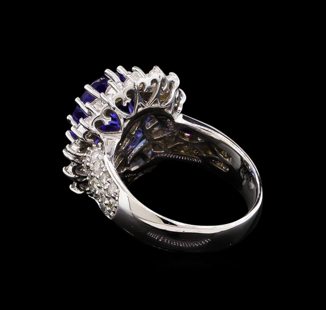One electronically tested 14KT white gold Ladies combination cast & assembled ring with a bright polish finish. Condition is new. Identified with markings of "K14". Containing: One prong set oval modified brilliant cut natural tanzanite, measuring 12.10 x 9.70 x 6.50mm, approximate weight of 5.17ct., clarity is eye clean, type I, medium, moderately strong, bluish violet color, (GIA bV 5/4), cut is good. Colored gemstones are presumed to have been subjected to commonly used color/clarity enhancement processes. Forty-One prong set round brilliant cut diamonds, measuring 1.50 - 1.30 x 0.84mm (depth est.) approximate. Total Weight of 41 Stones = 1.20ct. Clarity: I-1 to I-2. Color: I - J, Cut is Good. Fourteen prong set round brilliant cut diamonds, measuring 2.90 - 2.90 x 1.74mm (depth est.) approximate. Total Weight of 14 Stones = 1.25ct. Clarity: I-1 to I-2. Color: H - I, Cut is Good. Total Weight of Colored Stones 5.17ct. Total Weight of Diamonds 2.45ct. Total Weight of Ring 8.60 grams. GGL Appraised at $11,550.00.