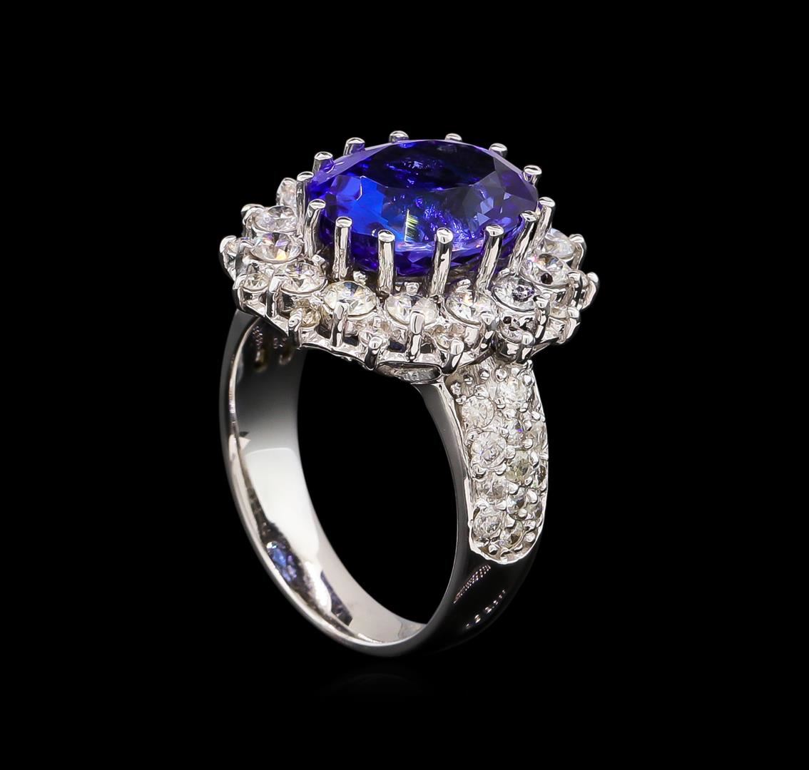 One electronically tested 14KT white gold Ladies combination cast & assembled ring with a bright polish finish. Condition is new. Identified with markings of "K14". Containing: One prong set oval modified brilliant cut natural tanzanite, measuring 12.10 x 9.70 x 6.50mm, approximate weight of 5.17ct., clarity is eye clean, type I, medium, moderately strong, bluish violet color, (GIA bV 5/4), cut is good. Colored gemstones are presumed to have been subjected to commonly used color/clarity enhancement processes. Forty-One prong set round brilliant cut diamonds, measuring 1.50 - 1.30 x 0.84mm (depth est.) approximate. Total Weight of 41 Stones = 1.20ct. Clarity: I-1 to I-2. Color: I - J, Cut is Good. Fourteen prong set round brilliant cut diamonds, measuring 2.90 - 2.90 x 1.74mm (depth est.) approximate. Total Weight of 14 Stones = 1.25ct. Clarity: I-1 to I-2. Color: H - I, Cut is Good. Total Weight of Colored Stones 5.17ct. Total Weight of Diamonds 2.45ct. Total Weight of Ring 8.60 grams. GGL Appraised at $11,550.00.