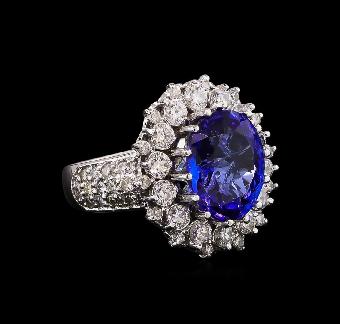 One electronically tested 14KT white gold Ladies combination cast & assembled ring with a bright polish finish. Condition is new. Identified with markings of "K14". Containing: One prong set oval modified brilliant cut natural tanzanite, measuring 12.10 x 9.70 x 6.50mm, approximate weight of 5.17ct., clarity is eye clean, type I, medium, moderately strong, bluish violet color, (GIA bV 5/4), cut is good. Colored gemstones are presumed to have been subjected to commonly used color/clarity enhancement processes. Forty-One prong set round brilliant cut diamonds, measuring 1.50 - 1.30 x 0.84mm (depth est.) approximate. Total Weight of 41 Stones = 1.20ct. Clarity: I-1 to I-2. Color: I - J, Cut is Good. Fourteen prong set round brilliant cut diamonds, measuring 2.90 - 2.90 x 1.74mm (depth est.) approximate. Total Weight of 14 Stones = 1.25ct. Clarity: I-1 to I-2. Color: H - I, Cut is Good. Total Weight of Colored Stones 5.17ct. Total Weight of Diamonds 2.45ct. Total Weight of Ring 8.60 grams. GGL Appraised at $11,550.00.