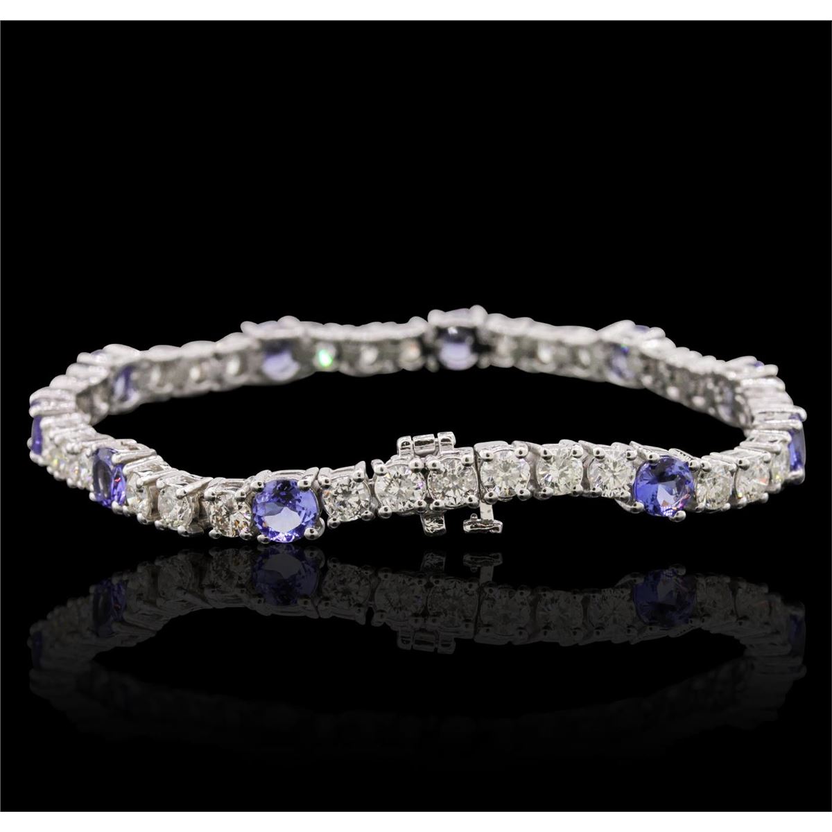 One electronically tested 14KT white gold ladies cast & assembled tanzanite and diamond bracelet with a bright polish finish. Condition is new, good workmanship. Seven and one-quarter inch length bracelet features a flexible tanzanite and diamond ribbon, terminating in a concealed clasp with safety bar. Identified with markings of "14K". Containing: Ten prong set round mixed cut natural tanzanites, measuring 5.10 - 5.00 x 2.80 mm, 6%. bulge factor, approximate. Total Weight of 5.20ct., clarity is eye clean, type I, medium dark, very slightly grayish, bluish violet color, (GIA bV 6/3), cut is good. Transmitting light with no distortion, transparent. Color grade is an average for the group. Graded in the setting. Tanzanite is a very rare gemstone that is only found in the country of Tanzania. Originally discovered in 1967. Tiffany & Company, named the stone Tanzanite. It is found in the Usumburu Mountains that border the Umba Valley of northern Tanzania. Tanzanite occurs in gray, brown, violet, blue, reddish-purple, & green. The gem is interesting because of its exceptional pleochroism. Rotated in different directions a tanzanite will exhibit multiple changes of color. Tanzanite has a low tolerance to ultrasonic cleaning, and should not be cleaned using this method. Thirty-Three prong set round brilliant cut diamonds, measuring 3.30 - 3.20 x 1.95mm (depth est.) approximate. Total Weight of 33 Stones = 4.00ct. Graded in the setting. Clarity: SI-2 to I-1. Color: H - J. Total Weight of Colored Stones 5.20ct. Total Weight of Diamonds 4.00ct. Total Weight of Bracelet 17.36 grams. AIG Appraised at $17,960.00.