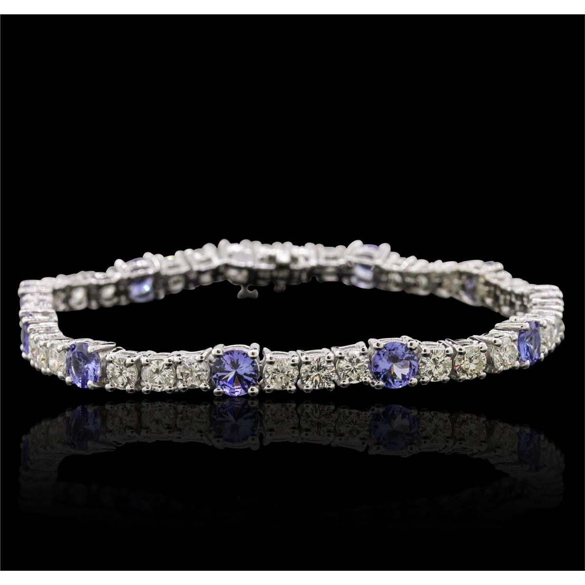 One electronically tested 14KT white gold ladies cast & assembled tanzanite and diamond bracelet with a bright polish finish. Condition is new, good workmanship. Seven and one-quarter inch length bracelet features a flexible tanzanite and diamond ribbon, terminating in a concealed clasp with safety bar. Identified with markings of "14K". Containing: Ten prong set round mixed cut natural tanzanites, measuring 5.10 - 5.00 x 2.80 mm, 6%. bulge factor, approximate. Total Weight of 5.20ct., clarity is eye clean, type I, medium dark, very slightly grayish, bluish violet color, (GIA bV 6/3), cut is good. Transmitting light with no distortion, transparent. Color grade is an average for the group. Graded in the setting. Tanzanite is a very rare gemstone that is only found in the country of Tanzania. Originally discovered in 1967. Tiffany & Company, named the stone Tanzanite. It is found in the Usumburu Mountains that border the Umba Valley of northern Tanzania. Tanzanite occurs in gray, brown, violet, blue, reddish-purple, & green. The gem is interesting because of its exceptional pleochroism. Rotated in different directions a tanzanite will exhibit multiple changes of color. Tanzanite has a low tolerance to ultrasonic cleaning, and should not be cleaned using this method. Thirty-Three prong set round brilliant cut diamonds, measuring 3.30 - 3.20 x 1.95mm (depth est.) approximate. Total Weight of 33 Stones = 4.00ct. Graded in the setting. Clarity: SI-2 to I-1. Color: H - J. Total Weight of Colored Stones 5.20ct. Total Weight of Diamonds 4.00ct. Total Weight of Bracelet 17.36 grams. AIG Appraised at $17,960.00.