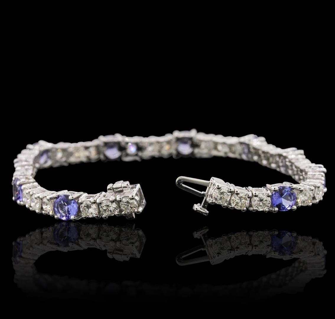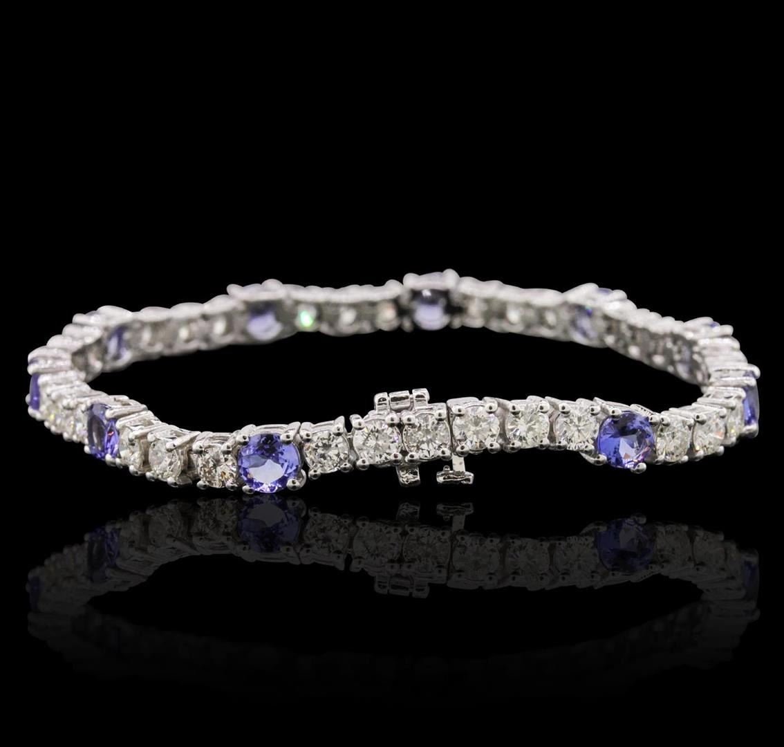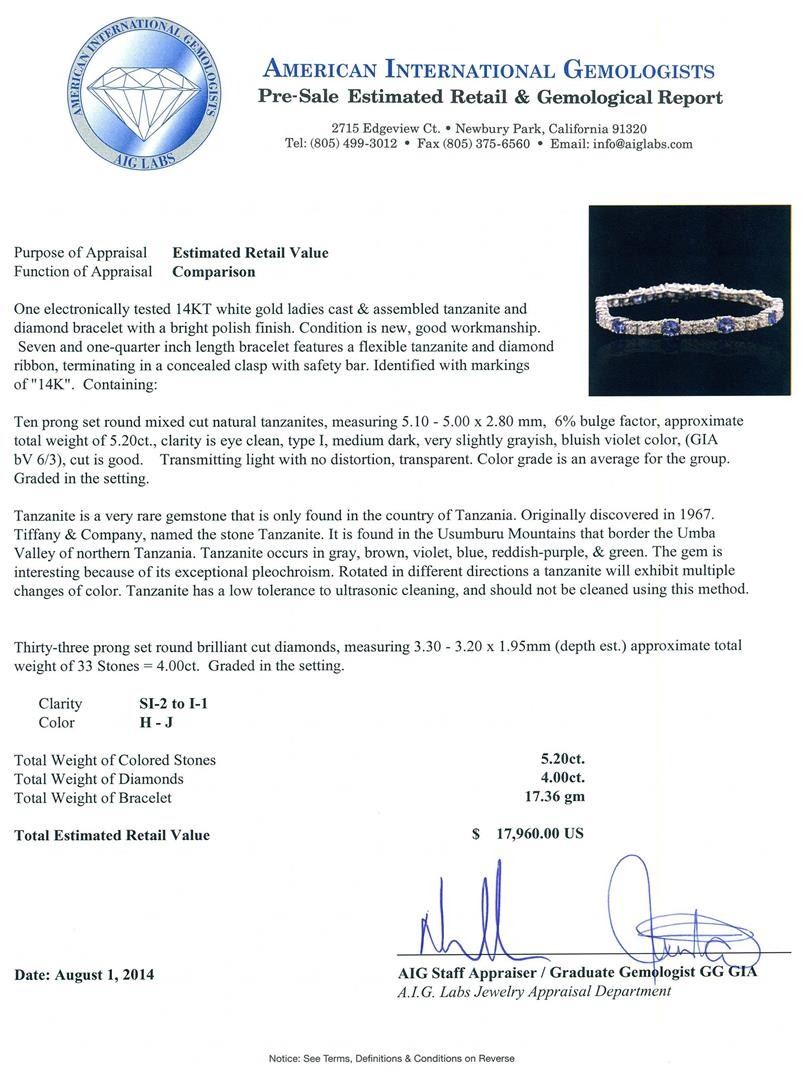 One electronically tested 14KT white gold ladies cast & assembled tanzanite and diamond bracelet with a bright polish finish. Condition is new, good workmanship. Seven and one-quarter inch length bracelet features a flexible tanzanite and diamond ribbon, terminating in a concealed clasp with safety bar. Identified with markings of "14K". Containing: Ten prong set round mixed cut natural tanzanites, measuring 5.10 - 5.00 x 2.80 mm, 6%. bulge factor, approximate. Total Weight of 5.20 ct., clarity is eye clean, type I, medium dark, very slightly grayish, bluish violet color, (GIA bV 6/3), cut is good. Transmitting light with no distortion, transparent. Color grade is an average for the group. Graded in the setting. Tanzanite is a very rare gemstone that is only found in the country of Tanzania. Originally discovered in 1967. Tiffany & Company, named the stone Tanzanite. It is found in the Usumburu Mountains that border the Umba Valley of northern Tanzania. Tanzanite occurs in gray, brown, violet, blue, reddish-purple, & green. The gem is interesting because of its exceptional pleochroism. Rotated in different directions a tanzanite will exhibit multiple changes of color. Tanzanite has a low tolerance to ultrasonic cleaning, and should not be cleaned using this method. Thirty-Three prong set round brilliant cut diamonds, measuring 3.30 - 3.20 x 1.95mm (depth est.) approximate. Total Weight of 33 Stones = 4.00 ct. Graded in the setting. Clarity: SI-2 to I-1. Color: H - J. Total Weight of Colored Stones 5.20 ct. Total Weight of Diamonds 4.00 ct. Total Weight of Bracelet 17.36 grams. AIG Appraised.