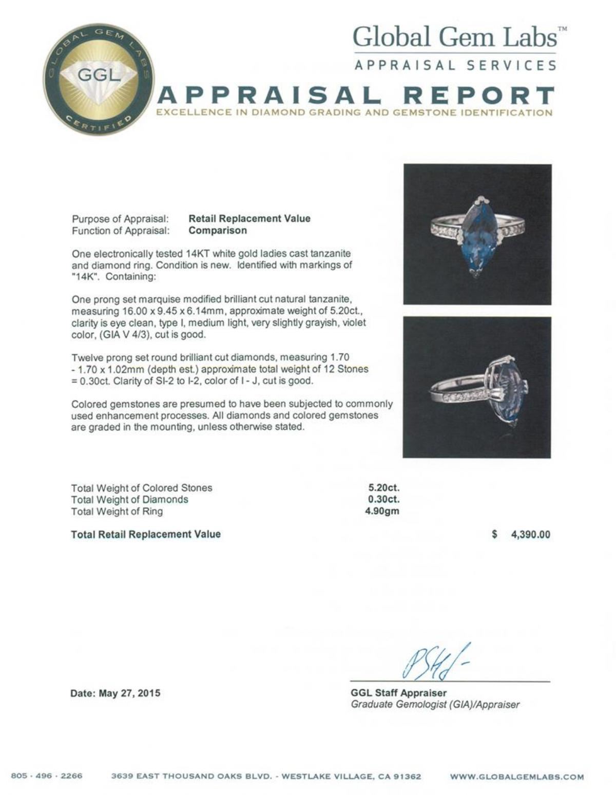 One electronically tested 14KT white gold ladies cast tanzanite and diamond ring. Identified with markings of "14K". Condition is new. Containing: One prong set marquise modified brilliant cut natural tanzanite, measuring 16.00 x 9.45 x 6.14mm, approximate weight of 5.20ct., clarity is eye clean, type I, medium light, very slightly grayish, violet color, (GIA V 4/3), cut is good. Twelve prong set round brilliant cut diamonds, measuring 1.70 - 1.70 x 1.02mm (depth est.) approximate total weight of 12 Stones = 0.30ct. Clarity: SI-2 to I-2. Color: I - J, Cut is Good. Colored gemstones are presumed to have been subjected to commonly used enhancement processes. All diamonds and colored gemstones are graded in the mounting, unless otherwise stated. Total Weight of Colored Stones 5.20ct. Total Weight of Diamonds 0.30ct. Total Weight of Ring 4.90 grams. GGL Appraised.