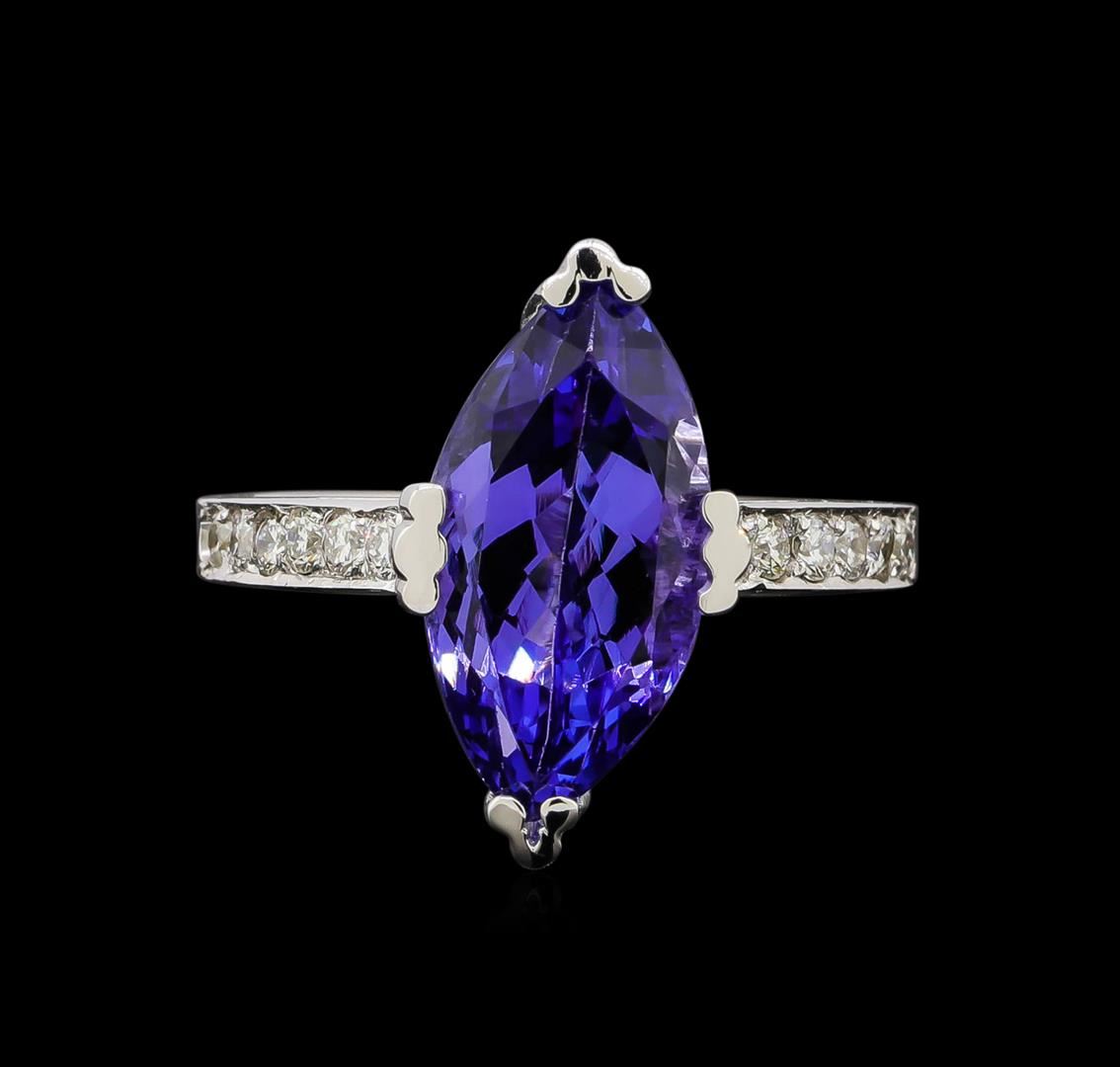 One electronically tested 14KT white gold ladies cast tanzanite and diamond ring. Identified with markings of "14K". Condition is new. Containing: One prong set marquise modified brilliant cut natural tanzanite, measuring 16.00 x 9.45 x 6.14mm, approximate weight of 5.20 ct., clarity is eye clean, type I, medium light, very slightly grayish, violet color, (GIA V 4/3), cut is good. Twelve prong set round brilliant cut diamonds, measuring 1.70 - 1.70 x 1.02mm (depth est.) approximate total weight of 12 Stones = 0.30 ct. Clarity: SI-2 to I-2. Color: I - J, Cut is Good. Colored gemstones are presumed to have been subjected to commonly used enhancement processes. All diamonds and colored gemstones are graded in the mounting, unless otherwise stated. Total Weight of Colored Stones 5.20 ct. Total Weight of Diamonds 0.30 ct. Total Weight of Ring 4.90 grams. GGL Appraised.