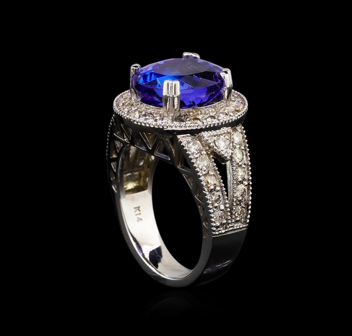 One electronically tested 14KT white gold Ladies combination cast & assembled ring with a bright polish finish. Condition is new. Identified with markings of "K14". Containing: One prong set oval modified brilliant cut natural tanzanite, measuring 12.51 x 9.79 x 6.26mm, approximate weight of 5.21ct., clarity is eye clean, type I, medium, moderately strong, bluish violet color, (GIA bV 5/4), cut is very good. Colored gemstones are presumed to have been subjected to commonly used color/clarity enhancement processes. Forty-Three prong set round brilliant cut diamonds, measuring 1.80 - 1.80 x 1.08mm (depth est.) approximate. Total Weight of 43 Stones = 0.92ct. Clarity: SI-2 to I-1. Color: I - J, Cut is Good. Total Weight of Colored Stones 5.21ct. Total Weight of Diamonds 0.92ct. Total Weight of Ring 9.50 grams. GGL Appraised at $9,545.00.