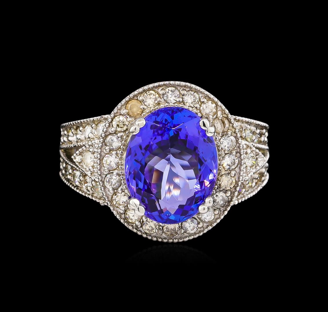 One electronically tested 14KT white gold Ladies combination cast & assembled ring with a bright polish finish. Condition is new. Identified with markings of "K14". Containing: One prong set oval modified brilliant cut natural tanzanite, measuring 12.51 x 9.79 x 6.26mm, approximate weight of 5.21ct., clarity is eye clean, type I, medium, moderately strong, bluish violet color, (GIA bV 5/4), cut is very good. Colored gemstones are presumed to have been subjected to commonly used color/clarity enhancement processes. Forty-Three prong set round brilliant cut diamonds, measuring 1.80 - 1.80 x 1.08mm (depth est.) approximate. Total Weight of 43 Stones = 0.92ct. Clarity: SI-2 to I-1. Color: I - J, Cut is Good. Total Weight of Colored Stones 5.21ct. Total Weight of Diamonds 0.92ct. Total Weight of Ring 9.50 grams. GGL Appraised at $9,545.00.