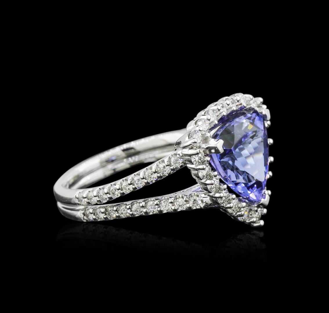 One electronically tested 14KT white gold ladies cast tanzanite and diamond ring with a bright polish finish. Identified with markings of "14K". Condition is new. Containing: One prong set triangle modified mixed cut natural tanzanite, measuring 11.00 x 11.00 x 7.16mm, approximate weight of 5.22ct., clarity is eye clean, type I, medium, moderately strong, bluish violet color, (GIA bV 5/4), cut is good. Fifty-Five prong set round brilliant cut diamonds, measuring 1.80 - 1.30 x 0.93mm (depth est.) approximate total weight of 55 Stones = 0.75ct. Clarity: SI-1 to I-1. Color: I - J, Cut is Good. Colored gemstones are presumed to have been subjected to commonly used enhancement processes. All diamonds and colored gemstones are graded in the mounting, unless otherwise stated. Total Weight of Colored Stones 5.22ct. Total Weight of Diamonds 0.75ct. Total Weight of Ring 6.10 grams. GGL Appraised at $5,995.00.