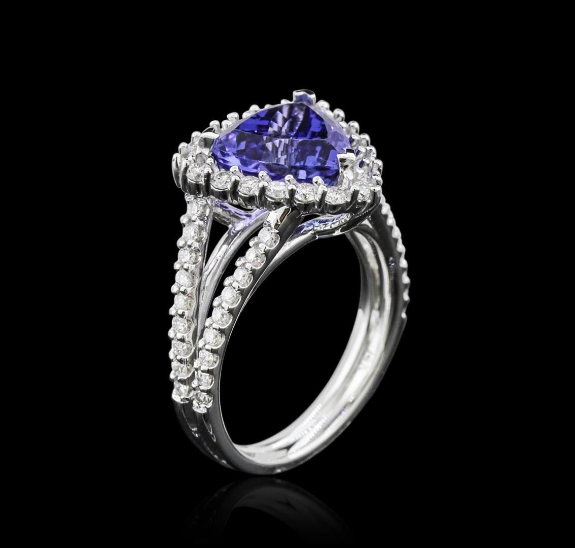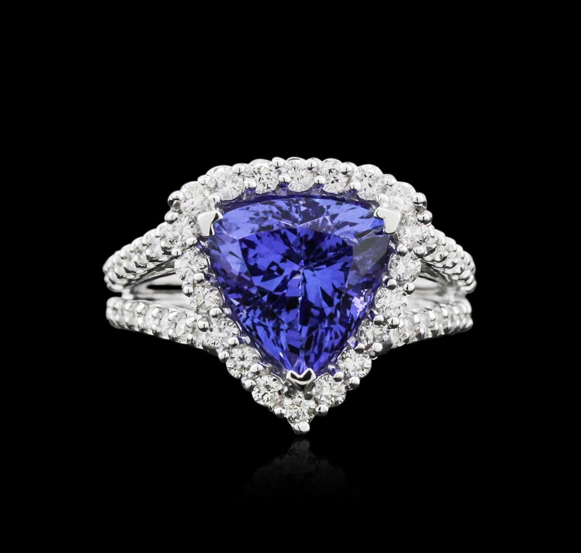 One electronically tested 14KT white gold ladies cast tanzanite and diamond ring with a bright polish finish. Identified with markings of "14K". Condition is new. Containing: One prong set triangle modified mixed cut natural tanzanite, measuring 11.00 x 11.00 x 7.16mm, approximate weight of 5.22ct., clarity is eye clean, type I, medium, moderately strong, bluish violet color, (GIA bV 5/4), cut is good. Fifty-Five prong set round brilliant cut diamonds, measuring 1.80 - 1.30 x 0.93mm (depth est.) approximate total weight of 55 Stones = 0.75ct. Clarity: SI-1 to I-1. Color: I - J, Cut is Good. Colored gemstones are presumed to have been subjected to commonly used enhancement processes. All diamonds and colored gemstones are graded in the mounting, unless otherwise stated. Total Weight of Colored Stones 5.22ct. Total Weight of Diamonds 0.75ct. Total Weight of Ring 6.10 grams. GGL Appraised at $5,995.00.