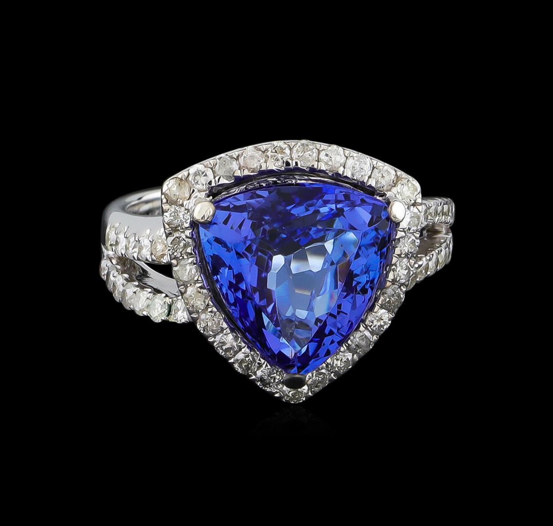 One electronically tested 14KT white gold ladies cast tanzanite and diamond ring with a bright polish finish. Identified with markings of "14K". Condition is new. Containing: One prong set triangle modified brilliant cut natural tanzanite, measuring 11.00 x 11.00 x 7.15mm, approximate weight of 5.22ct., clarity is eye clean, type I, medium light, very slightly grayish, violet color, (GIA V 4/3), cut is good. Fifty prong set round brilliant cut diamonds, measuring 1.30 - 1.30 x 0.78mm (depth est.) approximate total weight of 50 Stones = 0.40ct. Clarity: I-1 to I-2. Color: H - I. Colored gemstones are presumed to have been subjected to commonly used enhancement processes. All diamonds and colored gemstones are graded in the mounting, unless otherwise stated. Total Weight of Colored Stones 5.22ct. Total Weight of Diamonds 0.40ct. Total Weight of Ring 9.10 grams. GGL Appraised at $5,840.00.