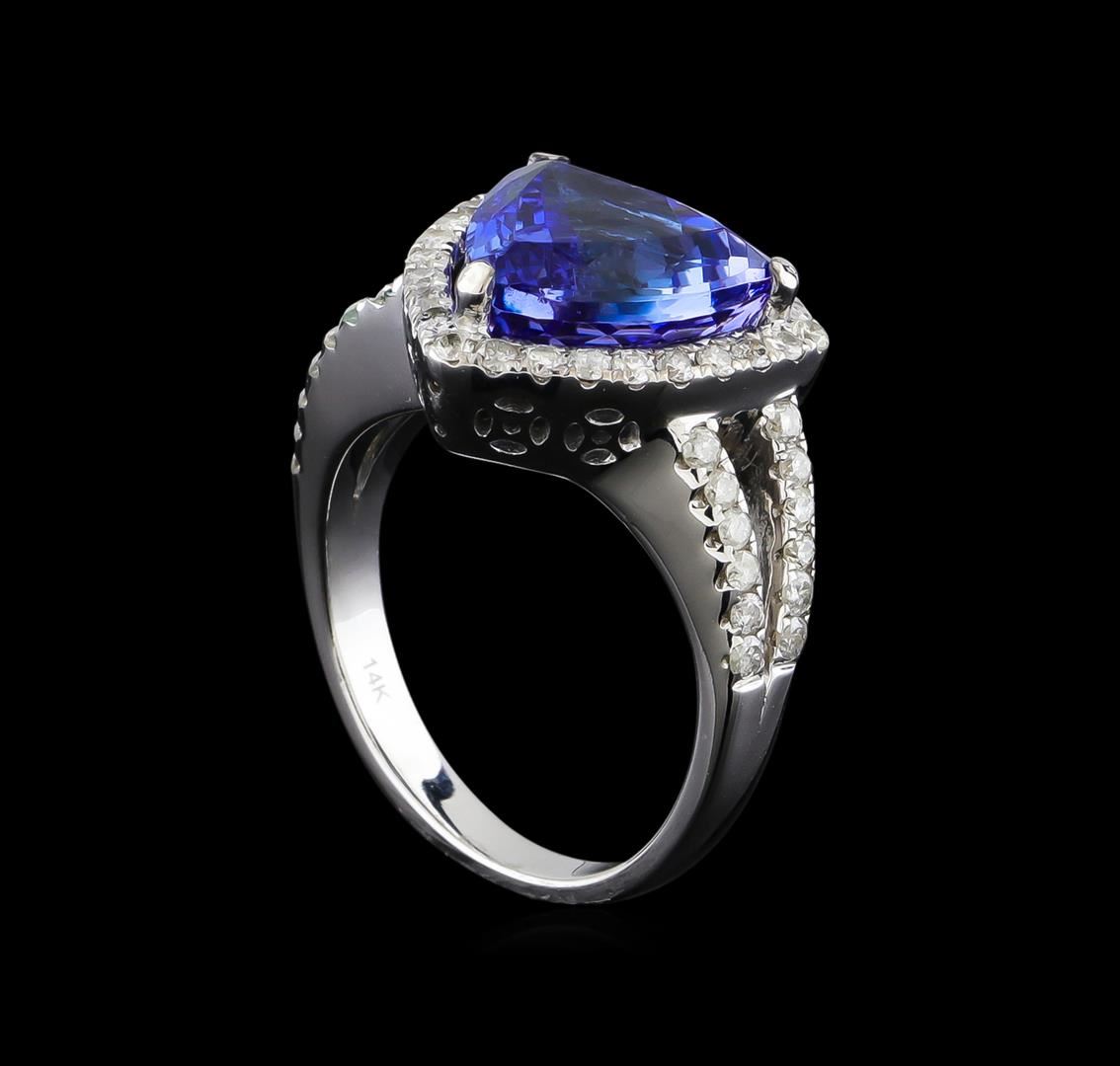 One electronically tested 14KT white gold ladies cast tanzanite and diamond ring with a bright polish finish. Identified with markings of "14K". Condition is new. Containing: One prong set triangle modified brilliant cut natural tanzanite, measuring 11.00 x 11.00 x 7.15mm, approximate weight of 5.22ct., clarity is eye clean, type I, medium light, very slightly grayish, violet color, (GIA V 4/3), cut is good. Fifty prong set round brilliant cut diamonds, measuring 1.30 - 1.30 x 0.78mm (depth est.) approximate total weight of 50 Stones = 0.40ct. Clarity: I-1 to I-2. Color: H - I. Colored gemstones are presumed to have been subjected to commonly used enhancement processes. All diamonds and colored gemstones are graded in the mounting, unless otherwise stated. Total Weight of Colored Stones 5.22ct. Total Weight of Diamonds 0.40ct. Total Weight of Ring 9.10 grams. GGL Appraised at $5,840.00.