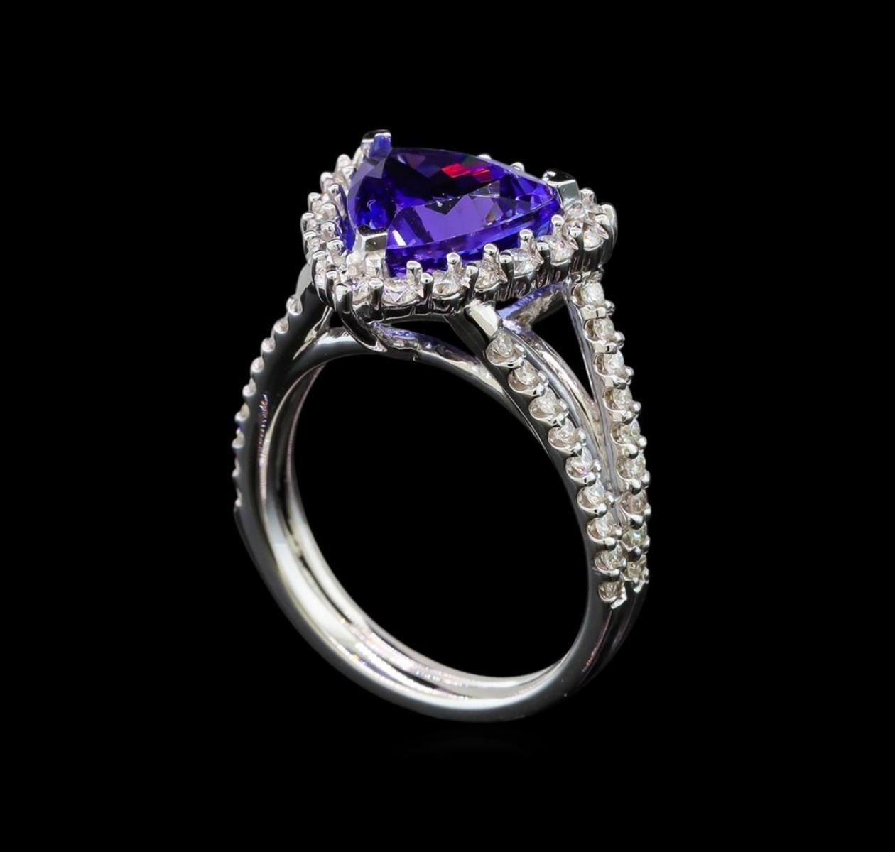 One electronically tested 14KT white gold ladies cast tanzanite and diamond ring with a bright polish finish. Identified with markings of "14K". Condition is new. Containing: One prong set triangle modified mixed cut natural tanzanite, measuring 11.00 x 11.00 x 7.16mm, approximate weight of 5.22ct., clarity is eye clean, type I, medium, moderately strong, bluish violet color, (GIA bV 5/4), cut is good. Fifty-Five prong set round brilliant cut diamonds, measuring 1.80 - 1.30 x 0.93mm (depth est.) approximate total weight of 55 Stones = 0.75ct. Clarity: SI-1 to I-1. Color: I - J, Cut is Good. Colored gemstones are presumed to have been subjected to commonly used enhancement processes. All diamonds and colored gemstones are graded in the mounting, unless otherwise stated. Total Weight of Colored Stones 5.22ct. Total Weight of Diamonds 0.75ct. Total Weight of Ring 6.10 grams. GGL Appraised.
