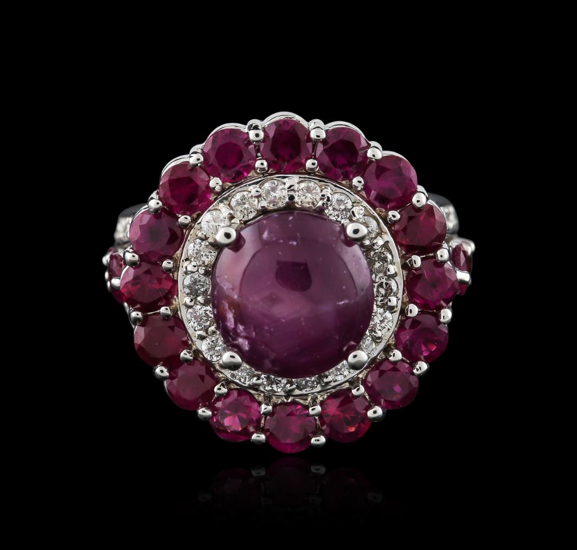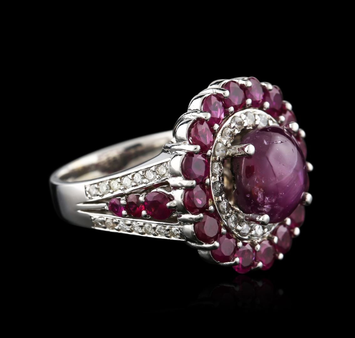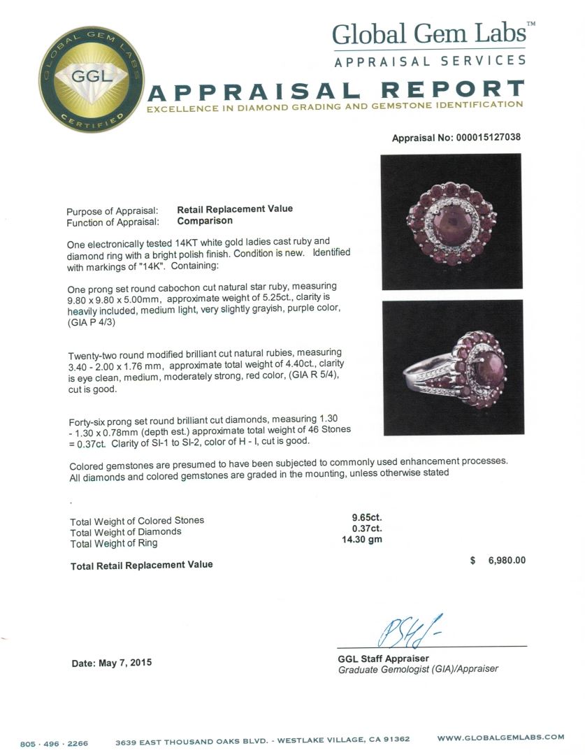 One electronically tested 14KT white gold ladies cast ruby and diamond ring with a bright polish finish. Identified with markings of "14K". Condition is new. Containing: One prong set round cabochon cut natural star ruby, measuring 9.80 x 9.80 x 5.00mm, approximate weight of 5.25ct., clarity is heavily included, medium light, very slightly grayish, purple color, (GIA P 4/3)Twenty-two round modified brilliant cut natural rubies, measuring 3.40 - 2.00 x 1.76 mm, approximate total weight of 4.40ct., clarity is eye clean, medium, moderately strong, red color, (GIA R 5/4), cut is good. Forty-Six prong set round brilliant cut diamonds, measuring 1.30 - 1.30 x 0.78mm (depth est.) approximate total weight of 46 Stones = 0.37ct. Clarity: SI-1 to SI-2. Color: H - I, Cut is Good. Colored gemstones are presumed to have been subjected to commonly used enhancement processes. All diamonds and colored gemstones are graded in the mounting, unless otherwise stated. Total Weight of Colored Stones 9.65ct. Total Weight of Diamonds 0.37ct. Total Weight of Ring 14.30 grams. GGL Appraised at $6,980.00.