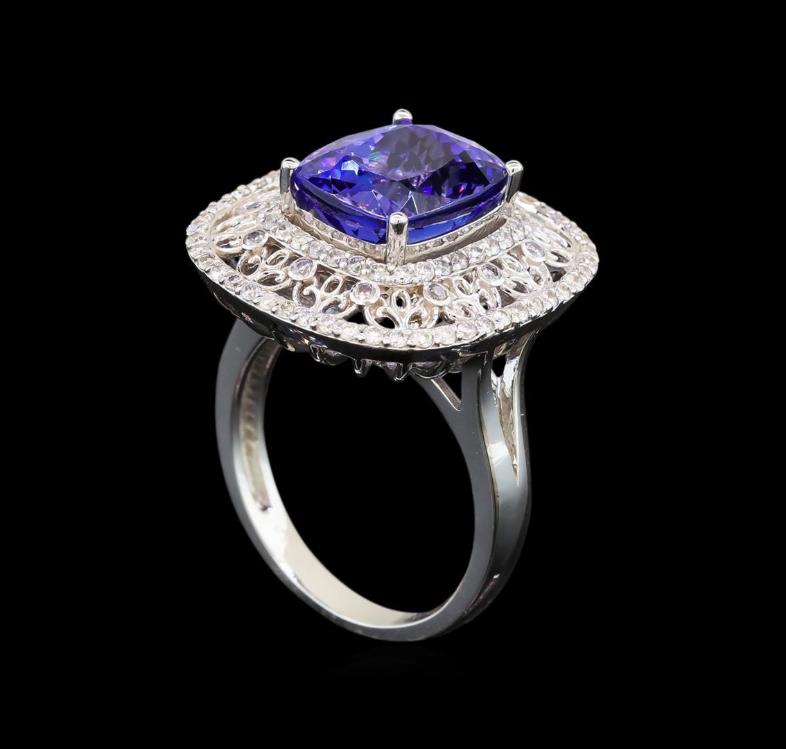One electronically tested 14KT white gold ladies cast tanzanite and diamond ring with a bright polish finish. Identified with markings of "K14". Condition is new. Containing: One prong set rectangular cushion modified brilliant cut natural tanzanite, measuring 10.90 x 8.80 x 7.00mm, approximate weight of 5.29ct., clarity is eye clean, type I, medium, moderately strong, bluish violet color, (GIA bV 5/4), cut is good. Ninety-Four prong set round brilliant cut diamonds, measuring 1.30 - 1.30 x 0.78mm (depth est.) approximate total weight of 94 Stones = 0.75ct. Clarity: SI-1 to I-1. Color: H - I, Cut is Good. Colored gemstones are presumed to have been subjected to commonly used enhancement processes. All diamonds and colored gemstones are graded in the mounting, unless otherwise stated. Total Weight of Colored Stones 5.29ct. Total Weight of Diamonds 0.75ct. Total Weight of Ring 7.50 grams. GGL Appraised.