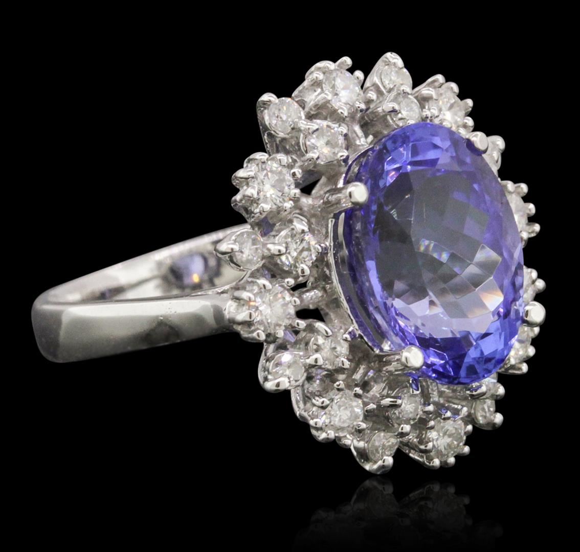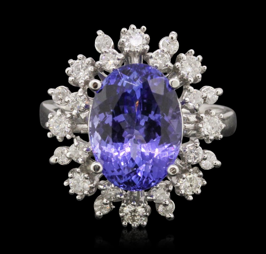One electronically tested 14KT white gold ladies cast tanzanite and diamond ring with a bright polish finish. Condition is new, good workmanship. The featured tanzanite is set within a stylized diamond bezel, completed by a three millimeter wide band. Identified with markings of "K14". Containing: One prong set oval brilliant cut natural tanzanite, measuring 12.10 x 8.85 x 6.80mm, 6%. bulge factor, approximate weight of 5.30ct., clarity is eye clean, type I, medium dark, very slightly grayish, bluish violet color, (GIA bV 6/3), cut is good. Transmitting light with no distortion, transparent. Colored Stone Grading Report attached. Graded in the setting.Tanzanite is a very rare gemstone that is only found in the country of Tanzania. Originally discovered in 1967. Tiffany & Company, named the stone Tanzanite. It is found in the Usumburu Mountains that border the Umba Valley of northern Tanzania. Tanzanite occurs in gray, brown, violet, blue, reddish-purple, & green. The gem is interesting because of its exceptional pleochroism. Rotated in different directions a tanzanite will exhibit multiple changes of color. Tanzanite has a low tolerance to ultrasonic cleaning, and should not be cleaned using this method.Twenty-Four prong set round brilliant cut diamonds, measuring 2.20 - 1.80 x 1.20mm (depth est.) approximate. Total Weight of 24 Stones = 0.80ct. Graded in the setting. Clarity: I-1 to I-2. Color: G - I. Total Weight of Colored Stones 5.30ct. Total Weight of Diamonds 0.80ct. Total Weight of Ring 6.33gm. AIG Appraised at $16,055.00.