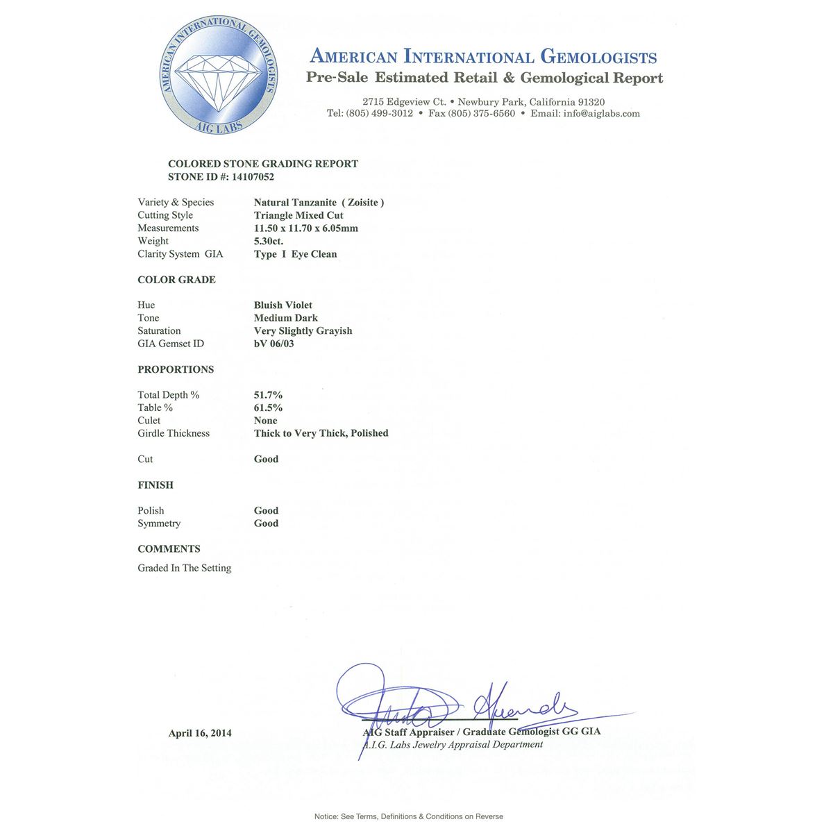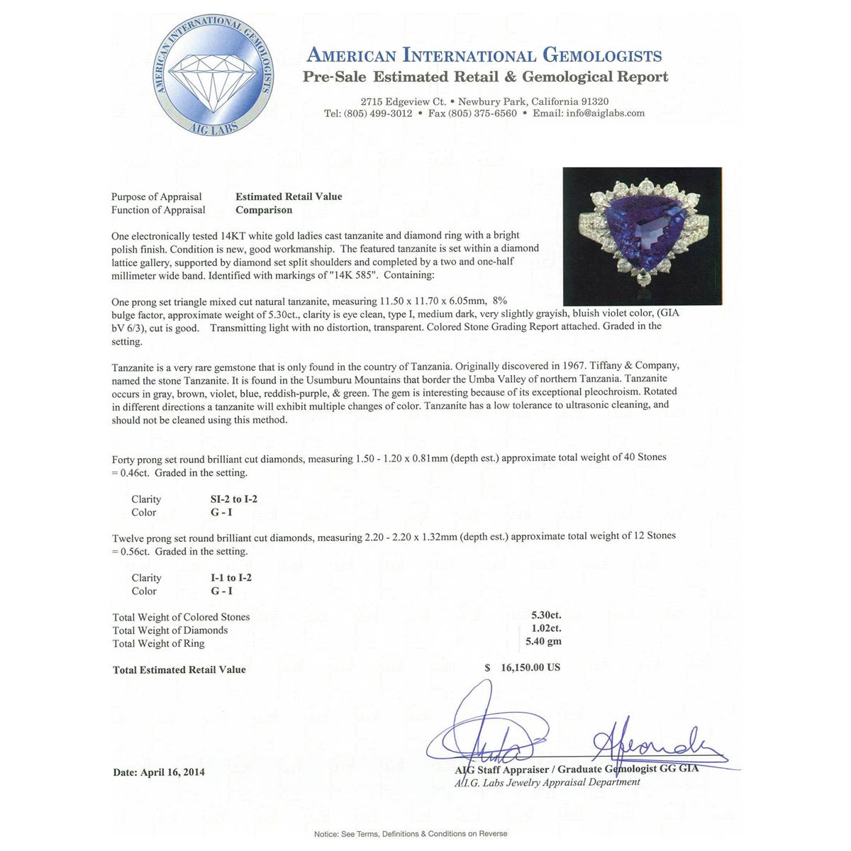 One electronically tested 14KT white gold ladies cast tanzanite and diamond ring with a bright polish finish. Condition is new, good workmanship. The featured tanzanite is set within a diamond lattice gallery, supported by diamond set split shoulders and completed by a two and one-half millimeter wide band. Identified with markings of "14K 585". Containing: One prong set triangle mixed cut natural tanzanite, measuring 11.50 x 11.70 x 6.05mm, 8%. bulge factor, approximate weight of 5.30ct., clarity is eye clean, type I, medium dark, very slightly grayish, bluish violet color, (GIA bV 6/3), cut is good. Transmitting light with no distortion, transparent. Colored Stone Grading Report attached. Graded in the setting. Tanzanite is a very rare gemstone that is only found in the country of Tanzania. Originally discovered in 1967. Tiffany & Company, named the stone Tanzanite. It is found in the Usumburu Mountains that border the Umba Valley of northern Tanzania. Tanzanite occurs in gray, brown, violet, blue, reddish-purple, & green. The gem is interesting because of its exceptional pleochroism. Rotated in different directions a tanzanite will exhibit multiple changes of color. Tanzanite has a low tolerance to ultrasonic cleaning, and should not be cleaned using this method. Forty prong set round brilliant cut diamonds, measuring 1.50 - 1.20 x 0.81mm (depth est.) approximate. Total Weight of 40 Stones = 0.46ct. Graded in the setting. Clarity: SI-2 to I-2. Color: G - I Twelve prong set round brilliant cut diamonds, measuring 2.20 - 2.20 x 1.32mm (depth est.) approximate. Total Weight of 12 Stones = 0.56ct. Graded in the setting. Clarity: I-1 to I-2. Color: G - I. Total Weight of Colored Stones 5.30ct. Total Weight of Diamonds 1.02ct. Total Weight of Ring 5.40 grams. AIG Appraised at $16,150.00.