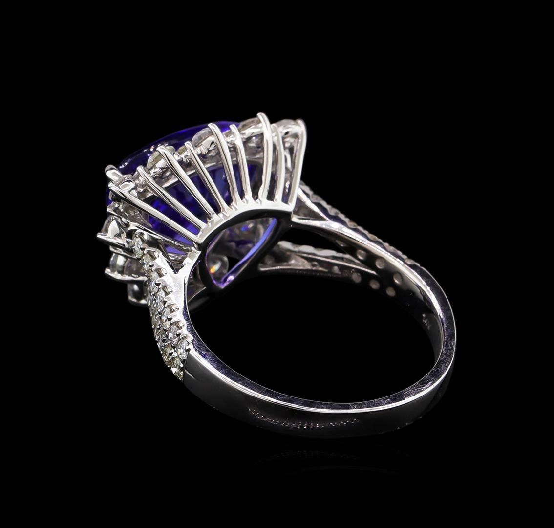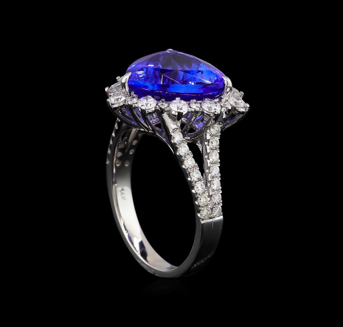 One electronically tested 14KT white gold ladies cast tanzanite and diamond ring with a bright polish finish. Condition is new, good workmanship. The featured tanzanite is set within a diamond lattice gallery, supported by diamond set split shoulders and completed by a two and one-half millimeter wide band. Identified with markings of "14K 585". Containing: One prong set triangle mixed cut natural tanzanite, measuring 11.50 x 11.70 x 6.05mm, 8%. bulge factor, approximate weight of 5.30ct., clarity is eye clean, type I, medium dark, very slightly grayish, bluish violet color, (GIA bV 6/3), cut is good. Transmitting light with no distortion, transparent. Colored Stone Grading Report attached. Graded in the setting. Tanzanite is a very rare gemstone that is only found in the country of Tanzania. Originally discovered in 1967. Tiffany & Company, named the stone Tanzanite. It is found in the Usumburu Mountains that border the Umba Valley of northern Tanzania. Tanzanite occurs in gray, brown, violet, blue, reddish-purple, & green. The gem is interesting because of its exceptional pleochroism. Rotated in different directions a tanzanite will exhibit multiple changes of color. Tanzanite has a low tolerance to ultrasonic cleaning, and should not be cleaned using this method. Forty prong set round brilliant cut diamonds, measuring 1.50 - 1.20 x 0.81mm (depth est.) approximate. Total Weight of 40 Stones = 0.46ct. Graded in the setting. Clarity: SI-2 to I-2. Color: G - I Twelve prong set round brilliant cut diamonds, measuring 2.20 - 2.20 x 1.32mm (depth est.) approximate. Total Weight of 12 Stones = 0.56ct. Graded in the setting. Clarity: I-1 to I-2. Color: G - I. Total Weight of Colored Stones 5.30ct. Total Weight of Diamonds 1.02ct. Total Weight of Ring 5.40 grams. AIG Appraised at $16,150.00.