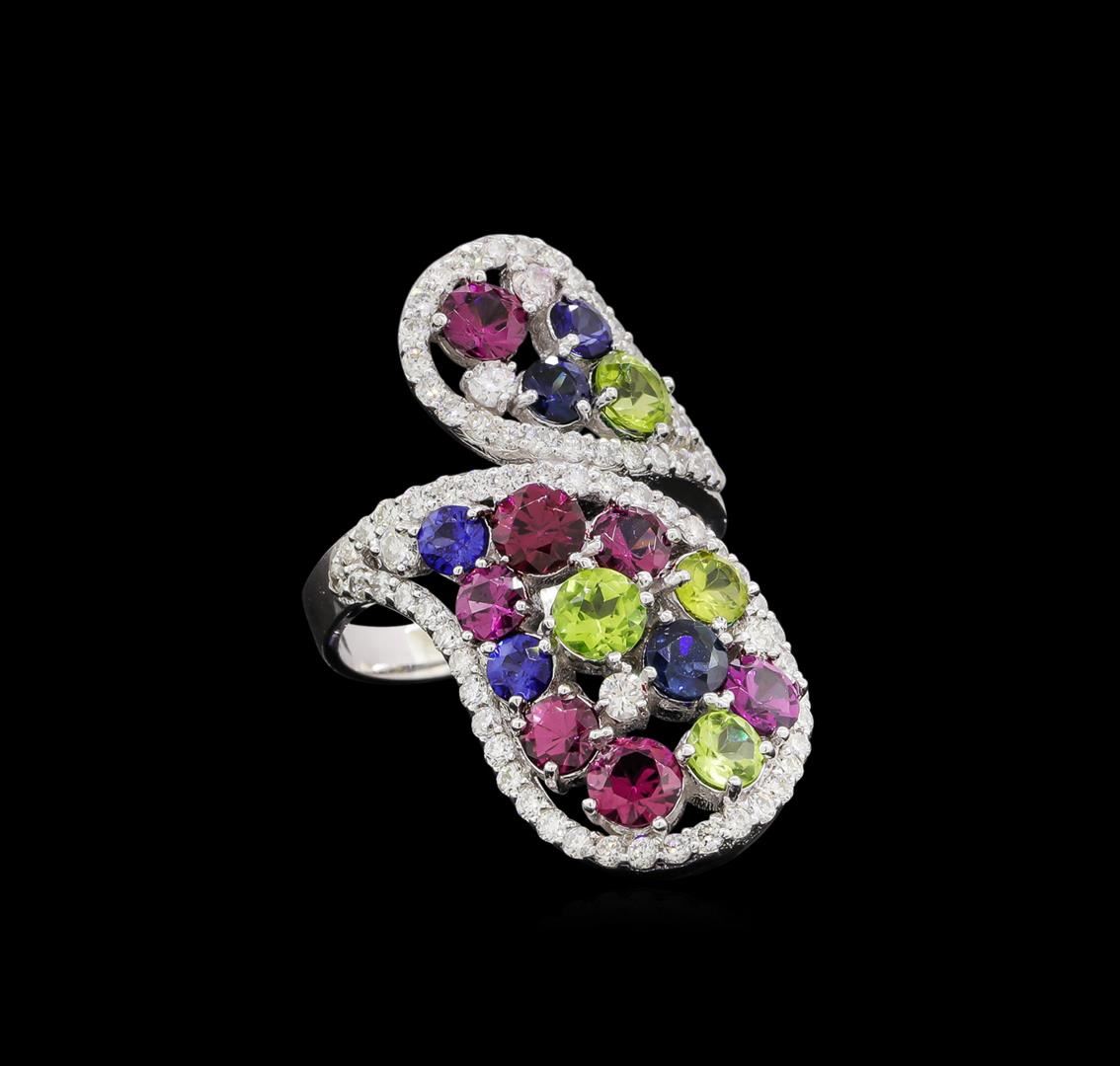 One electronically tested 14KT white gold ladies cast colored stones and diamond ring with a bright polish finish. Identified with markings of "14K". Condition is new. Containing: Five prong set round modified brilliant cut natural blue sapphires, measuring 4.00 - 3.00 x 2.28 mm, approximate total weight of 1.50ct., clarity is slightly included, medium, moderately strong, blue color, (GIA B 5/4), cut is good. Seven prong set round modified brilliant cut natural pink tourmalines, measuring 3.50 - 4.00 x 2.44 mm, approximate total weight of 1.26ct., clarity is eye clean, type II, medium, very slightly grayish, reddish purple color, (GIA rP 5/3), cut is good. Four prong set round modified brilliant cut natural peridots, measuring 5.10 - 4.20 x 3.02 mm, approximate total weight of 2.56ct., clarity is eye clean, medium, very slightly grayish, green color, (GIA G 5/3), cut is good. Five prong set round brilliant cut diamonds, measuring 2.10 - 2.10 x 1.26mm (depth est.) approximate total weight of 5 Stones = 0.17ct. Clarity: SI-1 to SI-2. Color: I - J, Cut is Good. Seventy-Two prong set round brilliant cut diamonds, measuring 1.30 - 1.20 x 0.75mm (depth est.) approximate total weight of 72 Stones = 0.51ct. Clarity: SI-1 to SI-2. Color: I - J, Cut is Good. Colored gemstones are presumed to have been subjected to commonly used enhancement processes. All diamonds and colored gemstones are graded in the mounting, unless otherwise stated. Total Weight of Colored Stones 5.32ct. Total Weight of Diamonds 0.68ct. Total Weight of Ring 7.90 grams. GGL Appraised at $3,860.00.