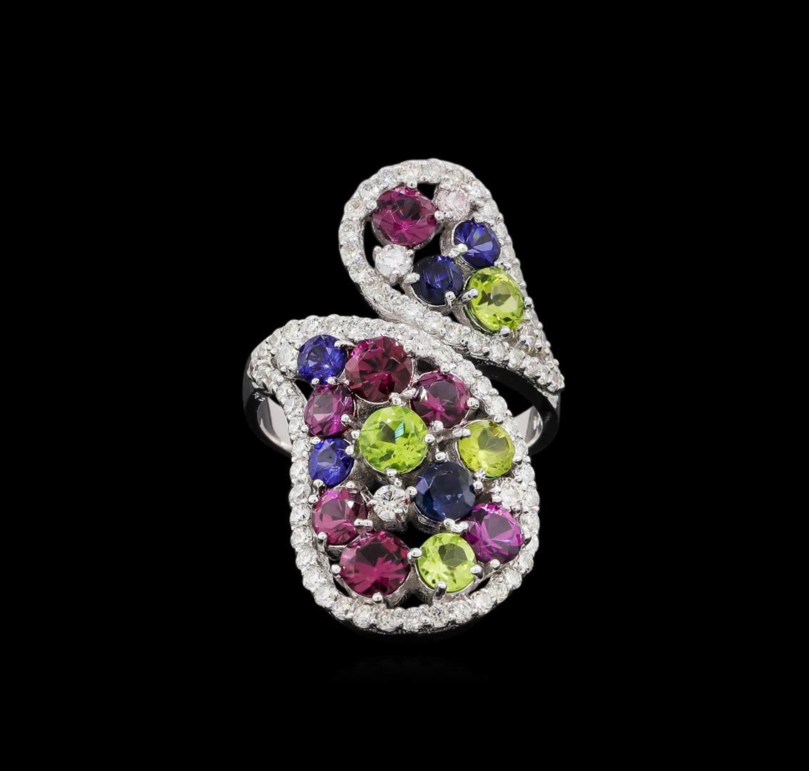One electronically tested 14KT white gold ladies cast colored stones and diamond ring with a bright polish finish. Identified with markings of "14K". Condition is new. Containing: Five prong set round modified brilliant cut natural blue sapphires, measuring 4.00 - 3.00 x 2.28 mm, approximate total weight of 1.50ct., clarity is slightly included, medium, moderately strong, blue color, (GIA B 5/4), cut is good. Seven prong set round modified brilliant cut natural pink tourmalines, measuring 3.50 - 4.00 x 2.44 mm, approximate total weight of 1.26ct., clarity is eye clean, type II, medium, very slightly grayish, reddish purple color, (GIA rP 5/3), cut is good. Four prong set round modified brilliant cut natural peridots, measuring 5.10 - 4.20 x 3.02 mm, approximate total weight of 2.56ct., clarity is eye clean, medium, very slightly grayish, green color, (GIA G 5/3), cut is good. Five prong set round brilliant cut diamonds, measuring 2.10 - 2.10 x 1.26mm (depth est.) approximate total weight of 5 Stones = 0.17ct. Clarity: SI-1 to SI-2. Color: I - J, Cut is Good. Seventy-Two prong set round brilliant cut diamonds, measuring 1.30 - 1.20 x 0.75mm (depth est.) approximate total weight of 72 Stones = 0.51ct. Clarity: SI-1 to SI-2. Color: I - J, Cut is Good. Colored gemstones are presumed to have been subjected to commonly used enhancement processes. All diamonds and colored gemstones are graded in the mounting, unless otherwise stated. Total Weight of Colored Stones 5.32ct. Total Weight of Diamonds 0.68ct. Total Weight of Ring 7.90 grams. GGL Appraised at $3,860.00.