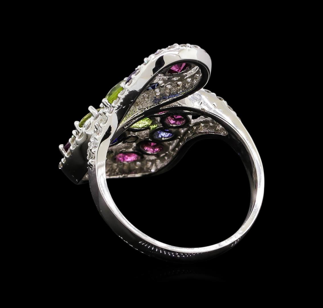 One electronically tested 14KT white gold ladies cast colored stones and diamond ring with a bright polish finish. Identified with markings of "14K". Condition is new. Containing: Five prong set round modified brilliant cut natural blue sapphires, measuring 4.00 - 3.00 x 2.28 mm, approximate total weight of 1.50ct., clarity is slightly included, medium, moderately strong, blue color, (GIA B 5/4), cut is good. Seven prong set round modified brilliant cut natural pink tourmalines, measuring 3.50 - 4.00 x 2.44 mm, approximate total weight of 1.26ct., clarity is eye clean, type II, medium, very slightly grayish, reddish purple color, (GIA rP 5/3), cut is good. Four prong set round modified brilliant cut natural peridots, measuring 5.10 - 4.20 x 3.02 mm, approximate total weight of 2.56ct., clarity is eye clean, medium, very slightly grayish, green color, (GIA G 5/3), cut is good. Five prong set round brilliant cut diamonds, measuring 2.10 - 2.10 x 1.26mm (depth est.) approximate total weight of 5 Stones = 0.17ct. Clarity: SI-1 to SI-2. Color: I - J, Cut is Good. Seventy-Two prong set round brilliant cut diamonds, measuring 1.30 - 1.20 x 0.75mm (depth est.) approximate total weight of 72 Stones = 0.51ct. Clarity: SI-1 to SI-2. Color: I - J, Cut is Good. Colored gemstones are presumed to have been subjected to commonly used enhancement processes. All diamonds and colored gemstones are graded in the mounting, unless otherwise stated. Total Weight of Colored Stones 5.32ct. Total Weight of Diamonds 0.68ct. Total Weight of Ring 7.90 grams. GGL Appraised at $3,860.00.