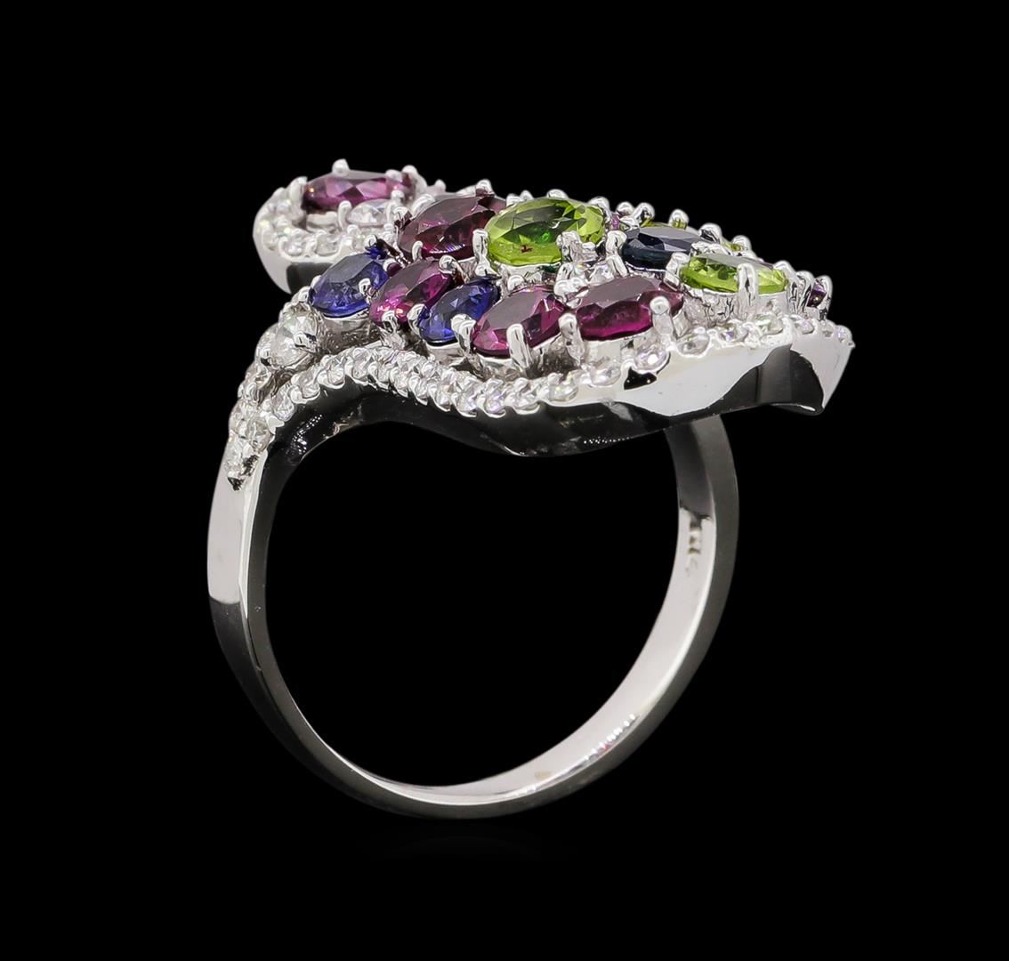 One electronically tested 14KT white gold ladies cast colored stones and diamond ring with a bright polish finish. Identified with markings of "14K". Condition is new. Containing: Five prong set round modified brilliant cut natural blue sapphires, measuring 4.00 - 3.00 x 2.28 mm, approximate total weight of 1.50ct., clarity is slightly included, medium, moderately strong, blue color, (GIA B 5/4), cut is good. Seven prong set round modified brilliant cut natural pink tourmalines, measuring 3.50 - 4.00 x 2.44 mm, approximate total weight of 1.26ct., clarity is eye clean, type II, medium, very slightly grayish, reddish purple color, (GIA rP 5/3), cut is good. Four prong set round modified brilliant cut natural peridots, measuring 5.10 - 4.20 x 3.02 mm, approximate total weight of 2.56ct., clarity is eye clean, medium, very slightly grayish, green color, (GIA G 5/3), cut is good. Five prong set round brilliant cut diamonds, measuring 2.10 - 2.10 x 1.26mm (depth est.) approximate total weight of 5 Stones = 0.17ct. Clarity: SI-1 to SI-2. Color: I - J, Cut is Good. Seventy-Two prong set round brilliant cut diamonds, measuring 1.30 - 1.20 x 0.75mm (depth est.) approximate total weight of 72 Stones = 0.51ct. Clarity: SI-1 to SI-2. Color: I - J, Cut is Good. Colored gemstones are presumed to have been subjected to commonly used enhancement processes. All diamonds and colored gemstones are graded in the mounting, unless otherwise stated. Total Weight of Colored Stones 5.32ct. Total Weight of Diamonds 0.68ct. Total Weight of Ring 7.90 grams. GGL Appraised at $3,860.00.