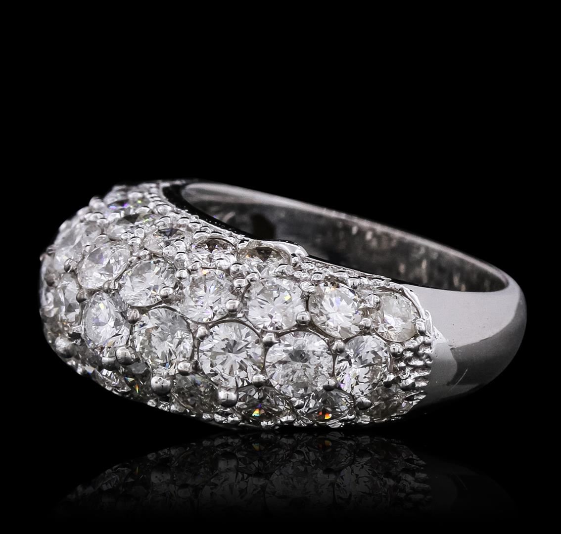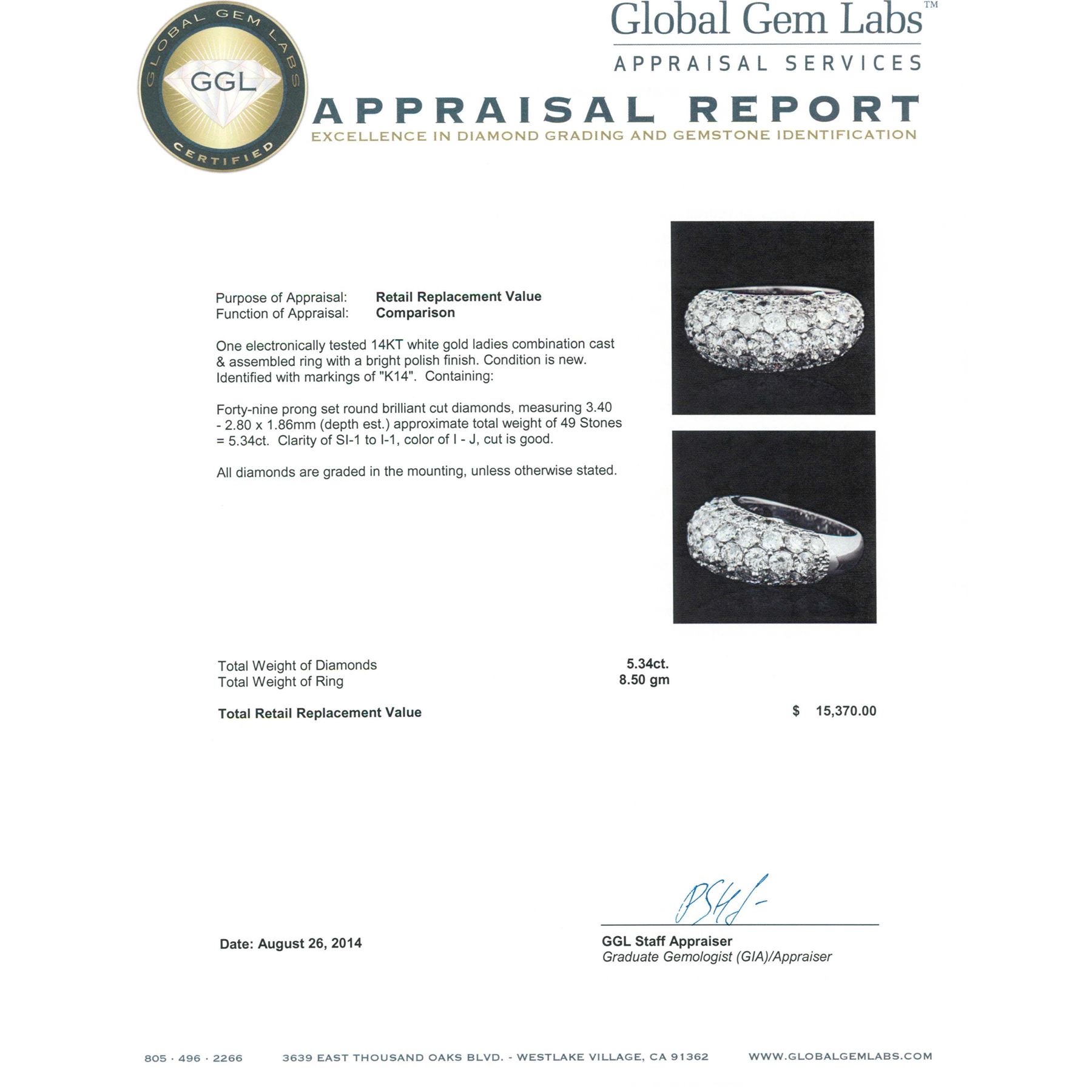 One electronically tested 14KT white gold ladies combination cast & assembled ring with a bright polish finish. Identified with markings of "K14". Condition is new. Containing: Forty-Nine prong set round brilliant cut diamonds, measuring 3.40 - 2.80 x 1.86mm (depth est.) approximate total weight of 49 Stones = 5.34ct. Clarity: SI-1 to I-1. Color: I - J, Cut is Good. All diamonds are graded in the mounting, unless otherwise stated. Total Weight of Diamonds 5.34ct. Total Weight of Ring 8.50 grams. GGL Appraised at $15,370.00.