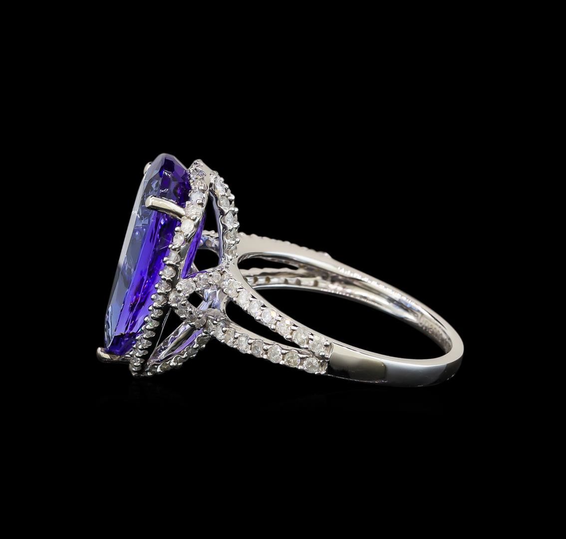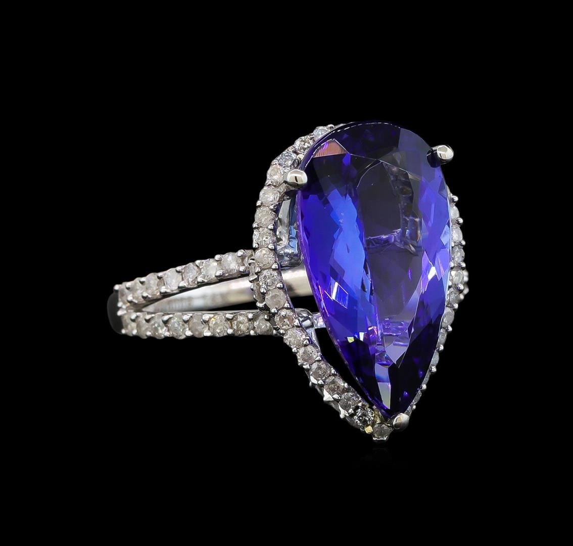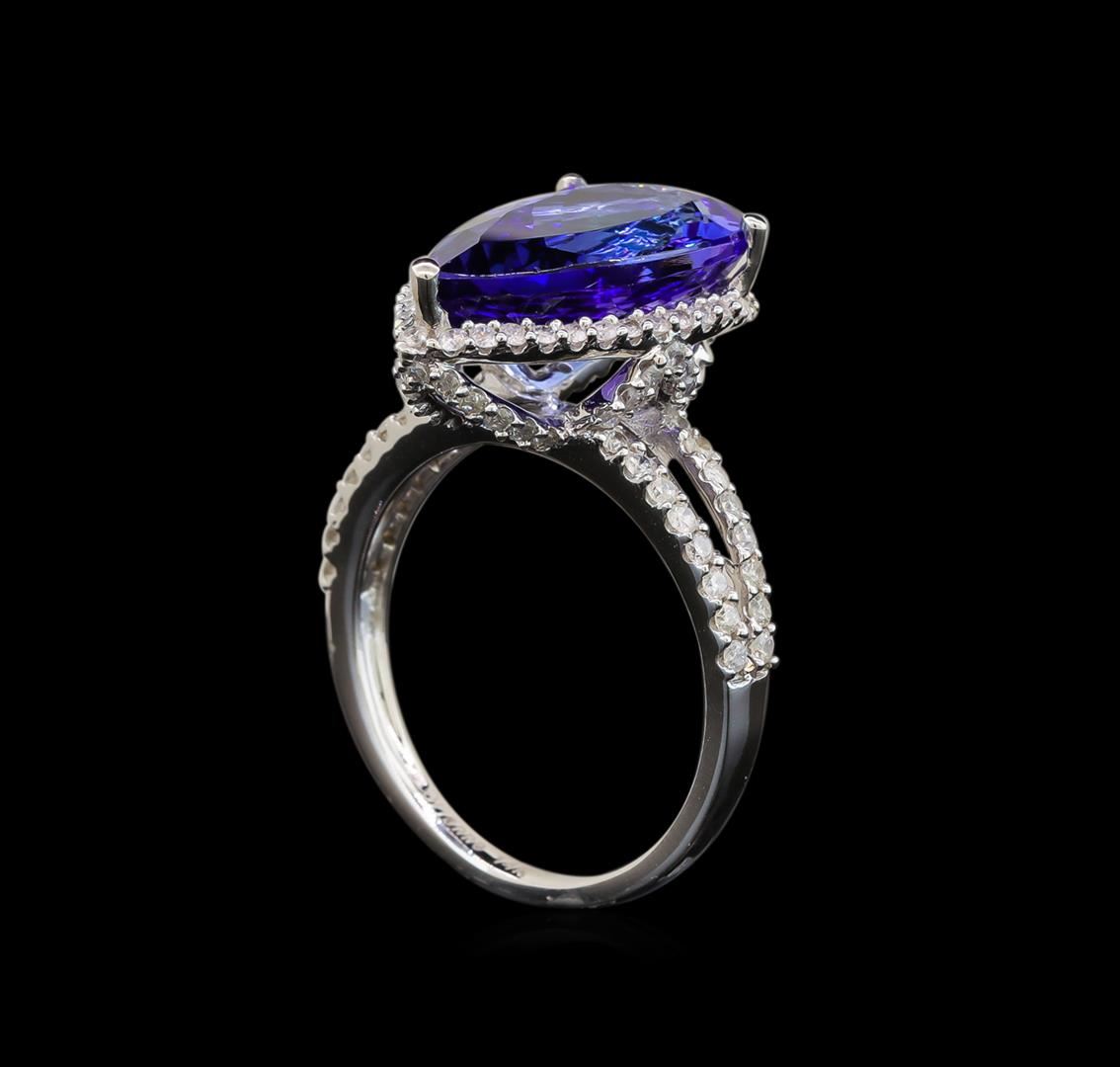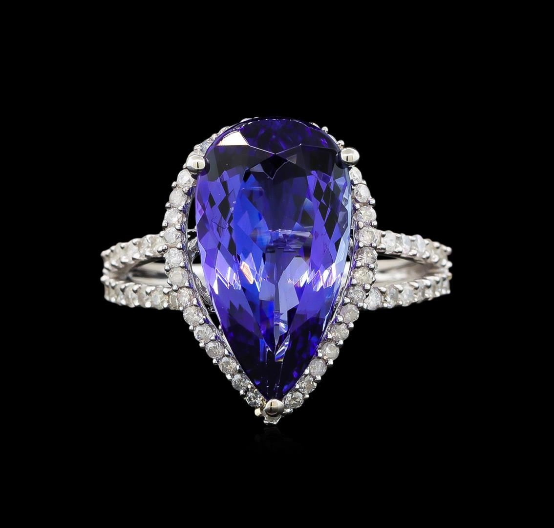 One electronically tested 14KT white gold ladies cast tanzanite and diamond ring with a split shank with a bright polish finish. Trademark is Orianne. Identified with markings of "14K". Condition is new. Containing: One prong set pear modified brilliant cut natural tanzanite, measuring 17.00 x 8.88 x 5.30mm, approximate weight of 5.36ct., clarity is eye clean, type I, medium, moderately strong, bluish violet color, (GIA bV 5/4), cut is good. Eight prong set round brilliant cut diamonds, measuring 1.10 - 1.10 x 0.66mm (depth est.) approximate total weight of 8 Stones = 0.04ct. Clarity: I-1 to I-2. Color: I - J, Cut is Good. All diamonds and colored gemstones are graded in the mounting, unless otherwise stated. Colored gemstones are presumed to have been subjected to commonly used enhancement processes. Total Weight of Colored Stones 5.36ct. Total Weight of Diamonds 0.04ct. Total Weight of Ring 4.30 grams. GGL Appraised at $6,395.00.