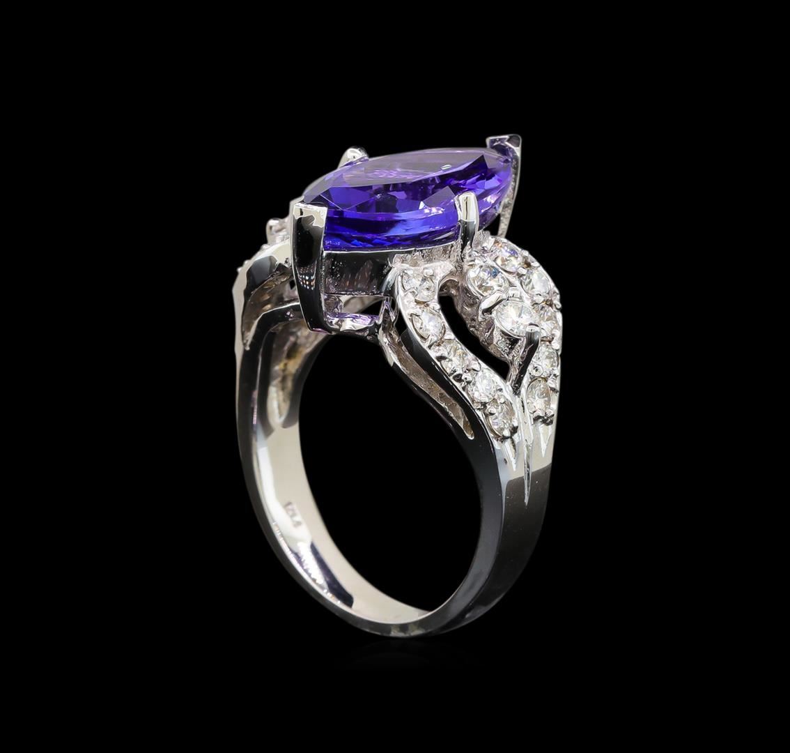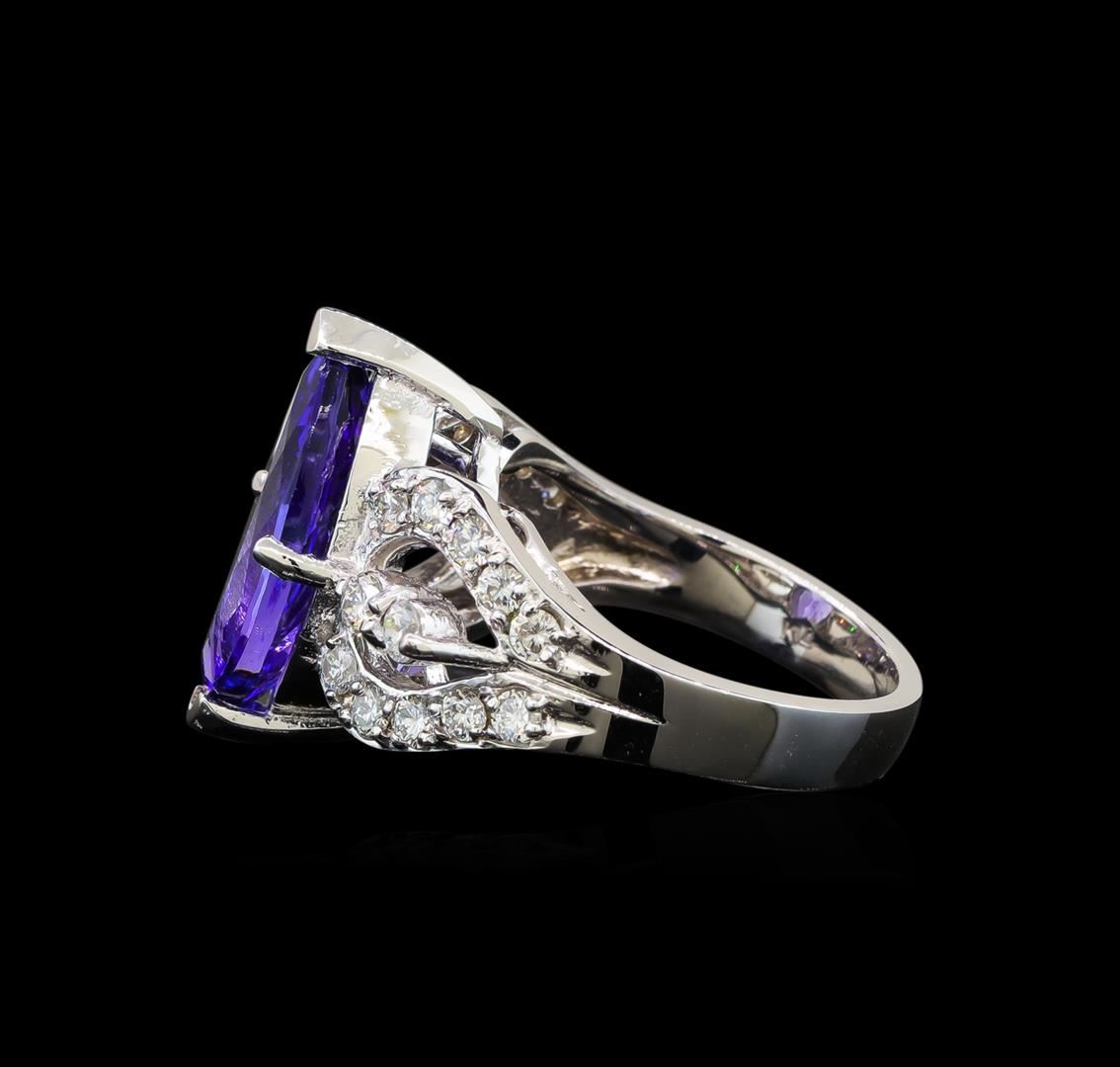 One electronically tested 14KT white gold ladies cast tanzanite and diamond ring with a bright polish finish. Identified with markings of "14K". Condition is new. Containing: One prong set marquise modified brilliant cut natural tanzanite, measuring 16.00. x 9.00. x 5.86mm, approximate weight of 5.37ct., clarity is eye clean, type I, medium light, very slightly grayish, bluish violet color, (GIA bV 4/3), cut is good. Twenty-Four prong set round brilliant cut diamonds, measuring 2.50 - 2.00. x 1.35mm (depth est.) approximate total weight of 24 Stones = 0.70ct. Clarity: SI-1 to SI-2. Color: I - J. All diamonds and colored gemstones are graded in the mounting, unless otherwise stated. Colored gemstones are presumed to have been subjected to commonly used enhancement processes. Total Weight of Colored Stones 5.37ct. Total Weight of Diamonds 0.70ct. Total Weight of Ring 8.20 grams. GGL Appraised at $5,980.00.