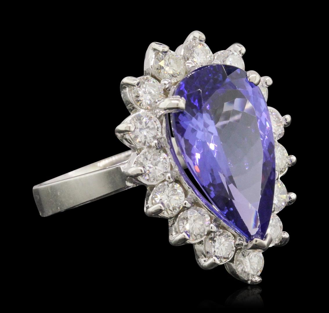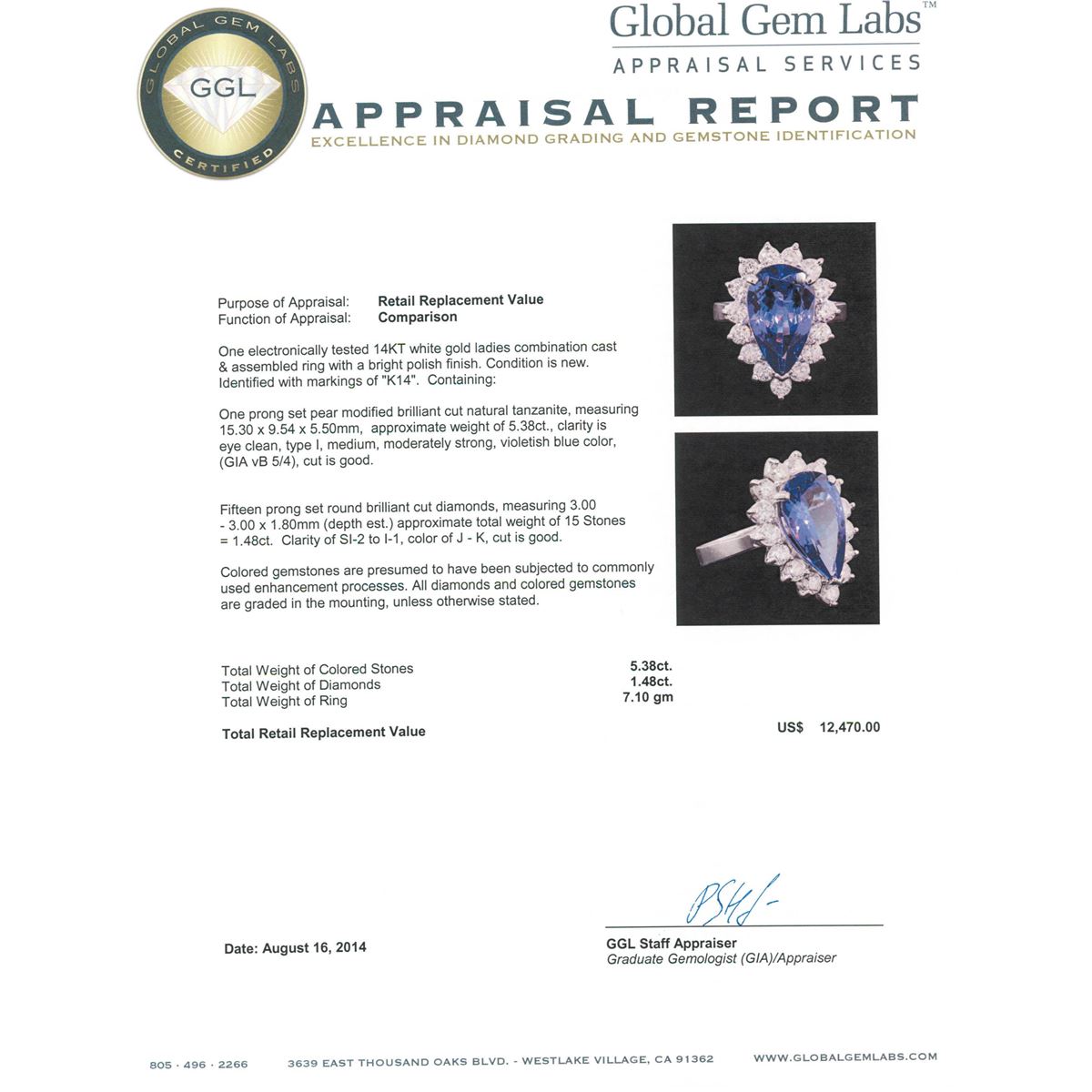 One electronically tested 14KT white gold ladies combination cast & assembled ring with a bright polish finish. Condition is new. Identified with markings of "K14". Containing: One prong set pear modified brilliant cut natural tanzanite, measuring 15.30 x 9.54 x 5.50mm, approximate weight of 5.38ct., clarity is eye clean, type I, medium, moderately strong, violetish blue color, (GIA vB 5/4), cut is good. Fifteen prong set round brilliant cut diamonds, measuring 3.00 - 3.00 x 1.80mm (depth est.) approximate. Total Weight of 15 Stones = 1.48ct. Clarity: SI-2 to I-1. Color: J - K, Cut is Good. Colored gemstones are presumed to have been subjected to commonly used enhancement processes. All diamonds and colored gemstones are graded in the mounting, unless otherwise stated. Total Weight of Colored Stones 5.38ct. Total Weight of Diamonds 1.48ct. Total Weight of Ring 7.10 grams. GGL Appraised at $12,470.00.