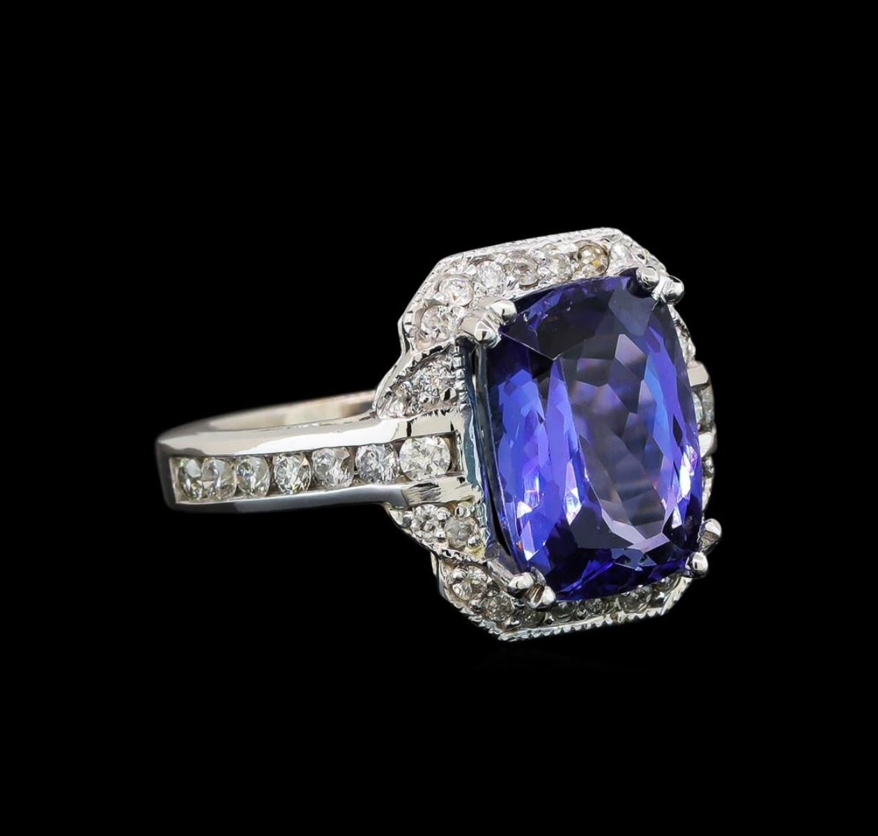 One electronically tested 14KT white gold ladies cast tanzanite and diamond ring with a bright polish finish. Identified with markings of "14K". Condition is new. Containing: One prong set rectangular cushion modified brilliant cut natural tanzanite, measuring 12.50 x 9.20 x 5.99mm, approximate weight of 5.42ct., clarity is eye clean, type I, medium, moderately strong, violet color, (GIA V 5/4), cut is good. Forty prong set round brilliant cut diamonds, measuring 2.00. - 1.30 x 0.99mm (depth est.) approximate total weight of 40 Stones = 0.50ct. Clarity: SI-1 to SI-2. Color: I - J. All diamonds and colored gemstones are graded in the mounting, unless otherwise stated. Colored gemstones are presumed to have been subjected to commonly used enhancement processes. Total Weight of Colored Stones 5.42ct. Total Weight of Diamonds 0.50ct. Total Weight of Ring 7.80 grams. GGL Appraised at $7,230.00.
