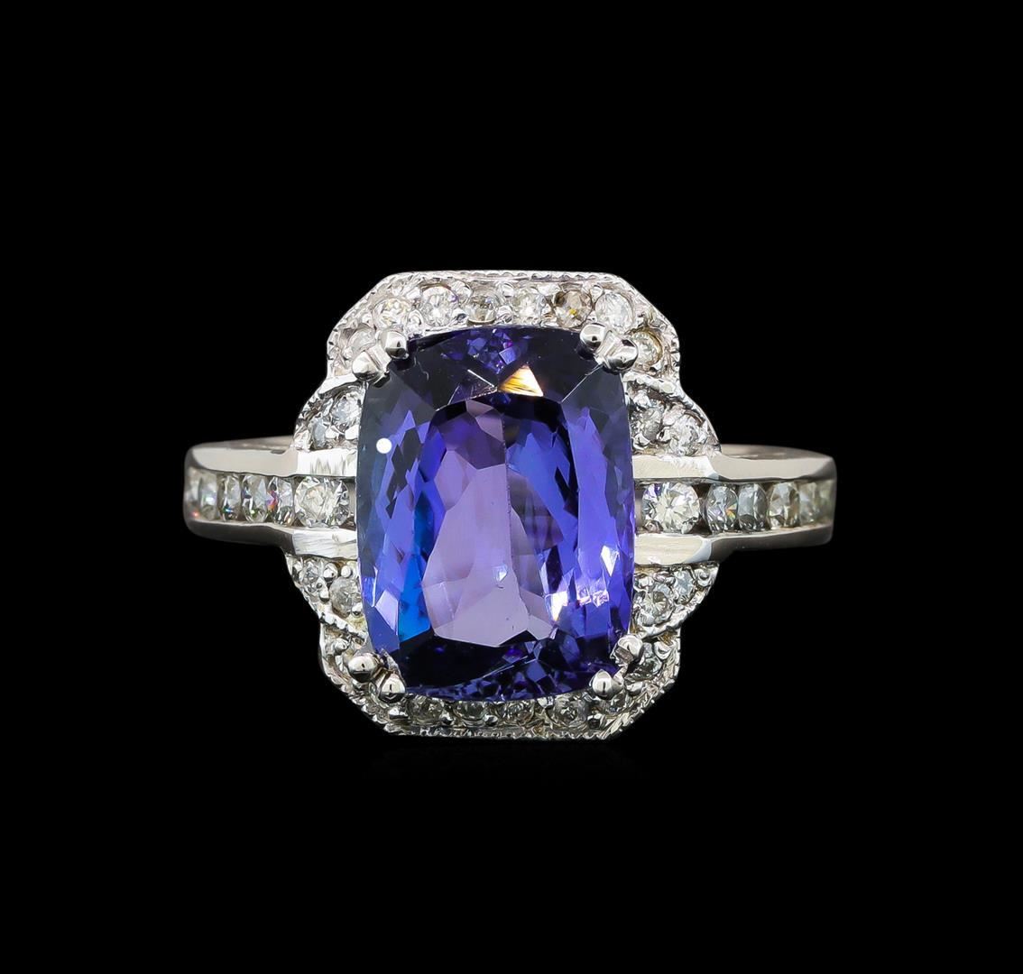 One electronically tested 14KT white gold ladies cast tanzanite and diamond ring with a bright polish finish. Identified with markings of "14K". Condition is new. Containing: One prong set rectangular cushion modified brilliant cut natural tanzanite, measuring 12.50 x 9.20 x 5.99mm, approximate weight of 5.42ct., clarity is eye clean, type I, medium, moderately strong, violet color, (GIA V 5/4), cut is good. Forty prong set round brilliant cut diamonds, measuring 2.00. - 1.30 x 0.99mm (depth est.) approximate total weight of 40 Stones = 0.50ct. Clarity: SI-1 to SI-2. Color: I - J. All diamonds and colored gemstones are graded in the mounting, unless otherwise stated. Colored gemstones are presumed to have been subjected to commonly used enhancement processes. Total Weight of Colored Stones 5.42ct. Total Weight of Diamonds 0.50ct. Total Weight of Ring 7.80 grams. GGL Appraised.