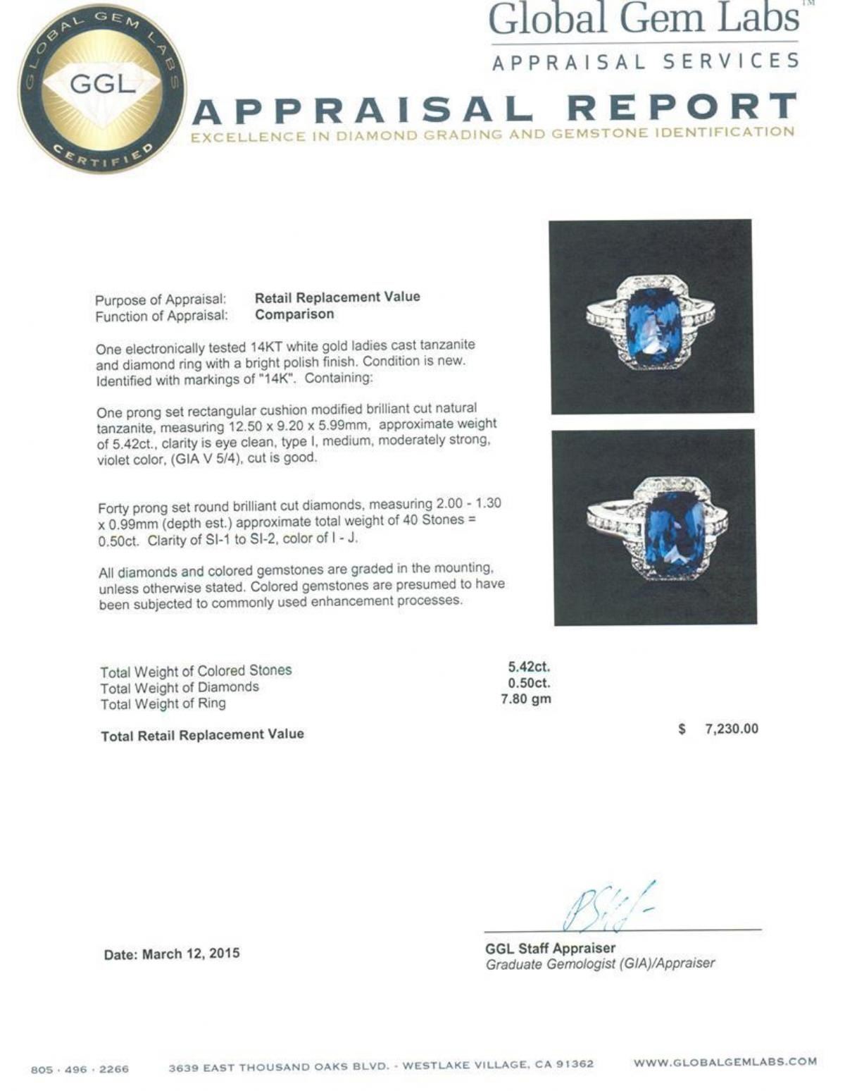 One electronically tested 14KT white gold ladies cast tanzanite and diamond ring with a bright polish finish. Identified with markings of "14K". Condition is new. Containing: One prong set rectangular cushion modified brilliant cut natural tanzanite, measuring 12.50 x 9.20 x 5.99mm, approximate weight of 5.42ct., clarity is eye clean, type I, medium, moderately strong, violet color, (GIA V 5/4), cut is good. Forty prong set round brilliant cut diamonds, measuring 2.00. - 1.30 x 0.99mm (depth est.) approximate total weight of 40 Stones = 0.50ct. Clarity: SI-1 to SI-2. Color: I - J. All diamonds and colored gemstones are graded in the mounting, unless otherwise stated. Colored gemstones are presumed to have been subjected to commonly used enhancement processes. Total Weight of Colored Stones 5.42ct. Total Weight of Diamonds 0.50ct. Total Weight of Ring 7.80 grams. GGL Appraised.