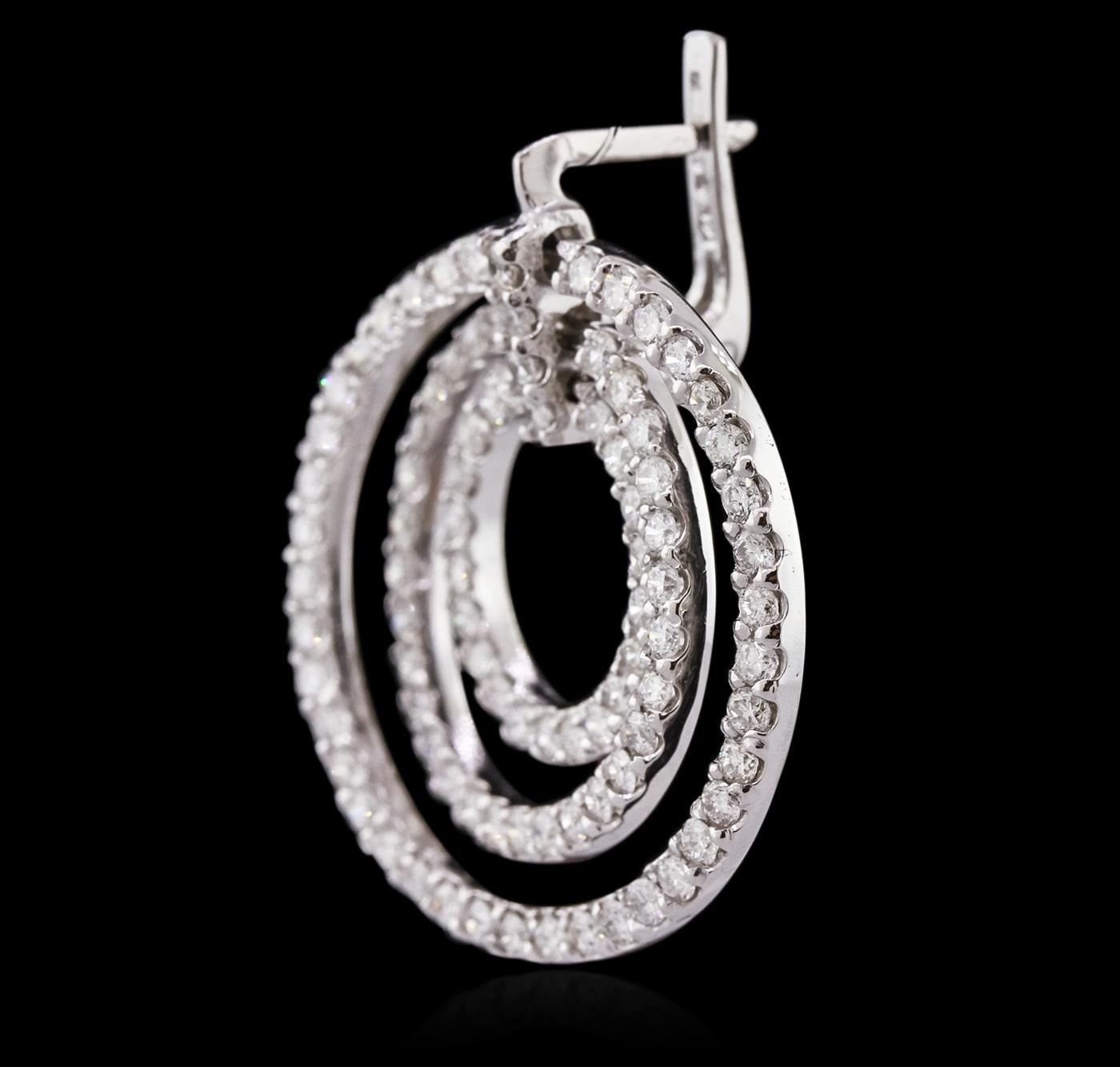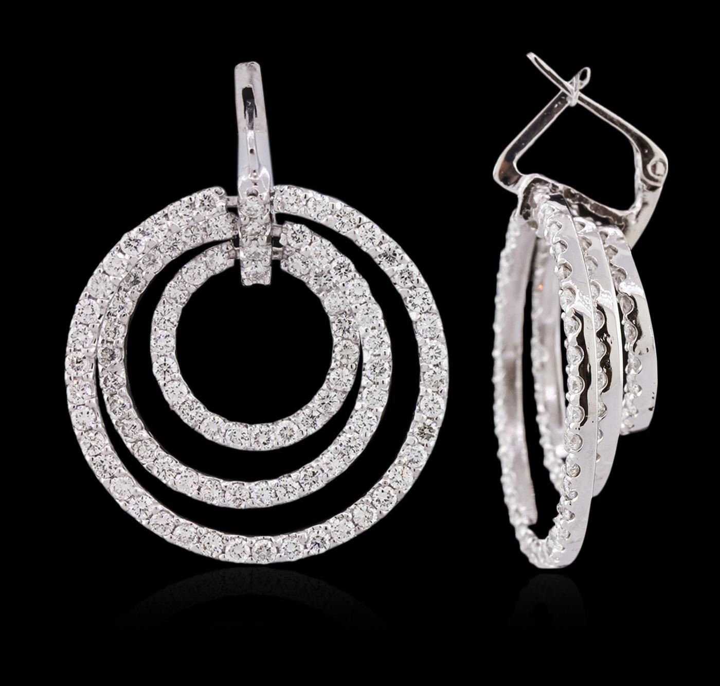 One pair electronically tested 14KT white gold ladies cast diamond earrings with hinged clip backs with a bright polish finish. Identified with markings of "14K". Condition is new. Containing: One Hundred Eighty-Six prong set round brilliant cut diamonds, measuring 2.00 - 2.00 x 1.20mm (depth est.) approximate total weight of 186 Stones = 5.43ct. Clarity: SI-2 to I-1. Color: I - J, Cut is Good. All diamonds are graded in the mounting, unless otherwise stated. Total Weight of Diamonds 5.43ct. Total Weight of Earrings 13.30 grams. GGL Appraised.