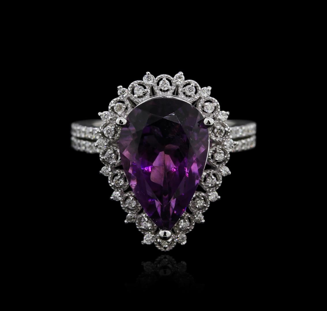 One electronically tested 14KT white gold ladies combination cast & assembled amethyst and diamond ring with a split shoulder shank with a bright polish finish. Identified with markings of "K14". Condition is new. Containing: One prong set pear modified brilliant cut natural amethyst, measuring 14.11 x 9.93 x 7.40mm, exact weight 5.50ct., clarity is eye clean, type II, medium light, moderately strong, purple color, (GIA P 4/4), cut is good. Sixty prong set round brilliant cut diamonds, measuring 1.10 - 1.10 x 0.66mm (depth est.) approximate total weight of 60 Stones = 0.41ct. Clarity: I-1 to I-2. Color: I - J, Cut is Good. All diamonds and colored gemstones are graded in the mounting, unless otherwise stated. Colored gemstones are presumed to have been subjected to commonly used enhancement processes.. Total Weight of Colored Stones 5.50ct. Total Weight of Diamonds 0.41ct. Total Weight of Ring 6.50 grams. GGL Appraised at $1,995.00.
