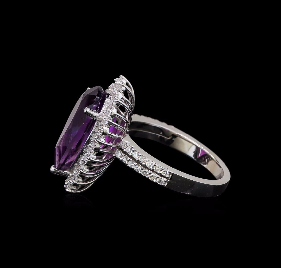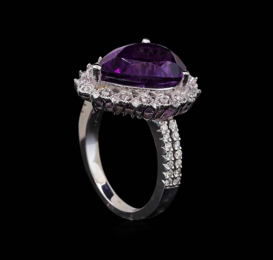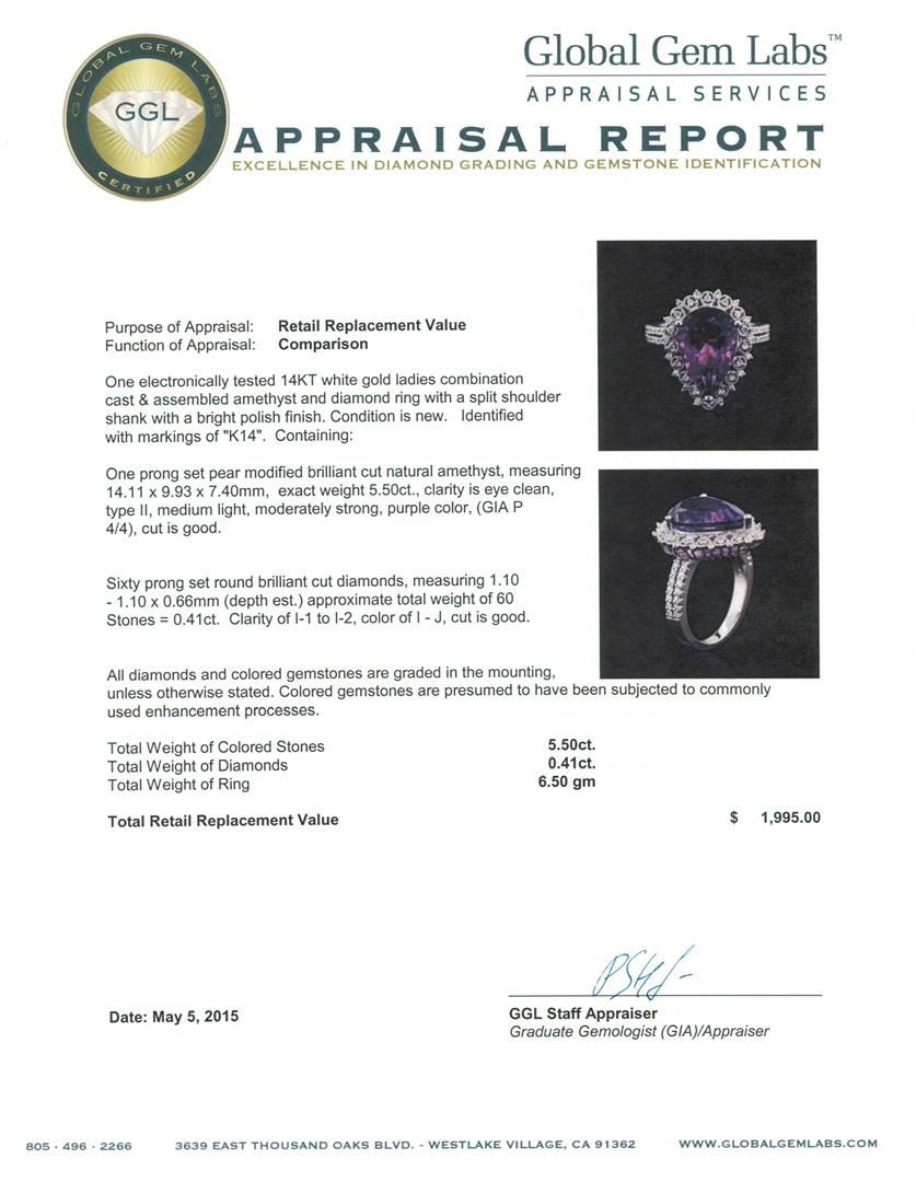 One electronically tested 14KT white gold ladies combination cast & assembled amethyst and diamond ring with a split shoulder shank with a bright polish finish. Identified with markings of "K14". Condition is new. Containing: One prong set pear modified brilliant cut natural amethyst, measuring 14.11 x 9.93 x 7.40mm, exact weight 5.50ct., clarity is eye clean, type II, medium light, moderately strong, purple color, (GIA P 4/4), cut is good. Sixty prong set round brilliant cut diamonds, measuring 1.10 - 1.10 x 0.66mm (depth est.) approximate total weight of 60 Stones = 0.41ct. Clarity: I-1 to I-2. Color: I - J, Cut is Good. All diamonds and colored gemstones are graded in the mounting, unless otherwise stated. Colored gemstones are presumed to have been subjected to commonly used enhancement processes.. Total Weight of Colored Stones 5.50ct. Total Weight of Diamonds 0.41ct. Total Weight of Ring 6.50 grams. GGL Appraised at $1,995.00.