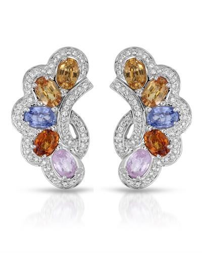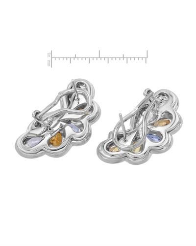 14KT White Gold 5.53ctw Multi Color Sapphire and Diamond Earrings. (10) Multi color sapphires with a total weight of 5.53cts. (116) Round Diamonds with a total weight of 0.62cts with a color of I and clarity of I-1. Measuring 27mm x 13mm. Total weight of these earrings are 12.73 grams.