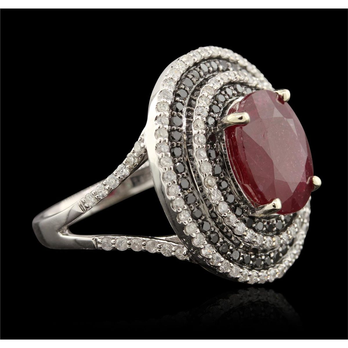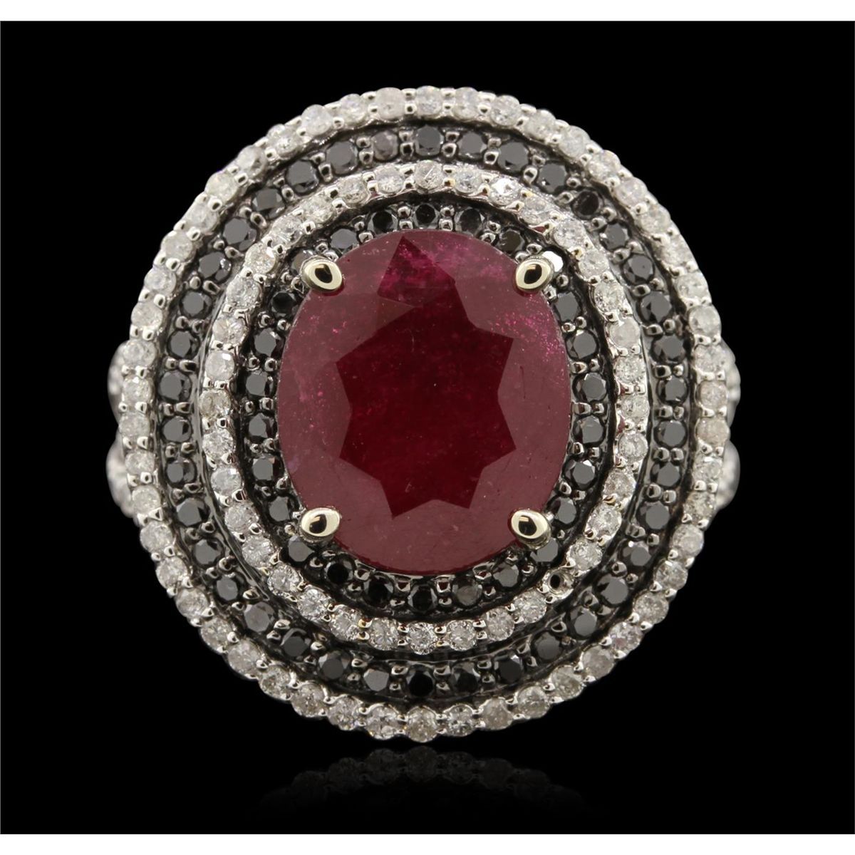 One electronically tested 14KT white gold Ladies combination cast & assembled cocktail ring with a bright polish finish. Identified with markings of "14K". Condition is excellent. Containing: One oval modified brilliant cut natural ruby, measuring 10.70 x 9.20 x 6.10mm, approximate weight of 5.55ct., type II Indications of heat treatment with glass and flux residue. Colored gemstones are presumed to have been subjected to commonly used and possible undetectable color/clarity enhancement processes. One Hundred Ten prong set round brilliant cut diamonds, measuring 1.00 - 1.00 x 0.60mm (depth est.) approximate total weight of 110 Stones = 0.58ct. Clarity of I-2 to I-3, Color of H - I. Sixty-Four prong set round brilliant cut diamonds, measuring 1.10 - 1.10 x 0.66mm (depth est.) approximate total weight of 64 Stones = 0.44ct. Total Weight of Colored Stones 5.55ct. Total Weight of Diamonds 1.02ct. Total Weight of Ring 7.20gm. GGL Appraised at $6,620.00.